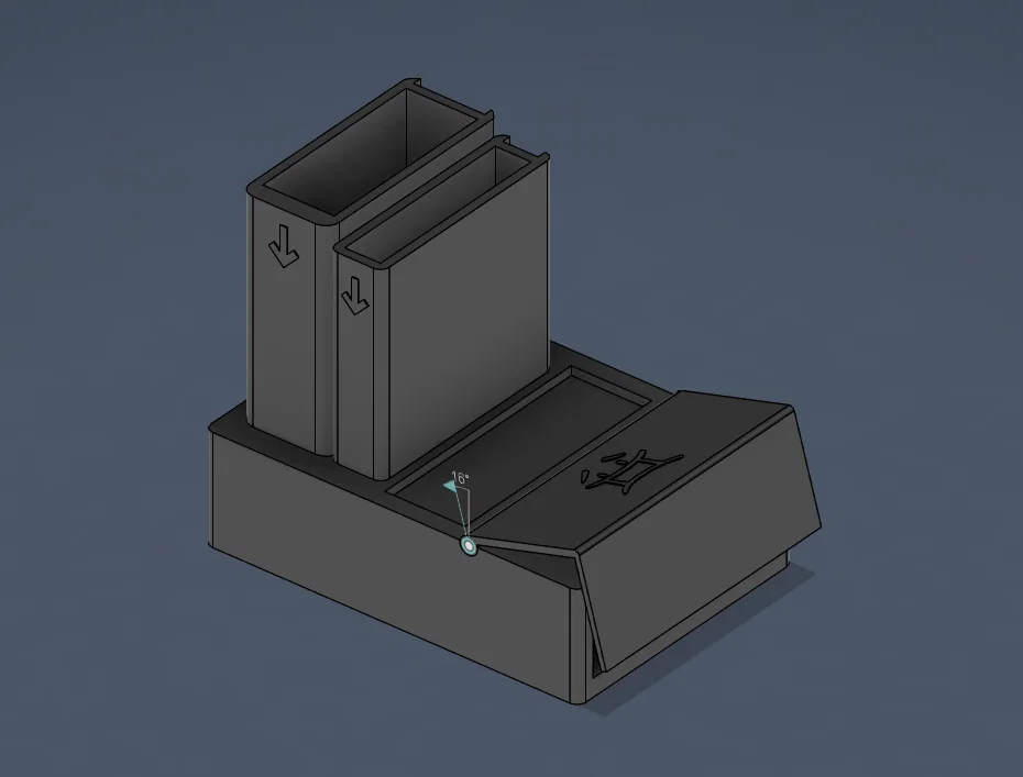 Một chiếc ống đựng bút có một khoảng không gian nhỏ để chứa bút/viết (tất nhiên rồi XD) và vài món đồ linh tinh mà mình không nỡ dẹp đi khỏi bàn làm việc. Ngoài ra, nó còn có một phần mở rộng nhỏ ở bên hông để giữ một chiếc đồng hồ cát tí hon mà mình đang có. Mô hình này gồm hai phần: phần thân và phần nắp trượt vào rãnh đã được tạo sẵn trên thân.