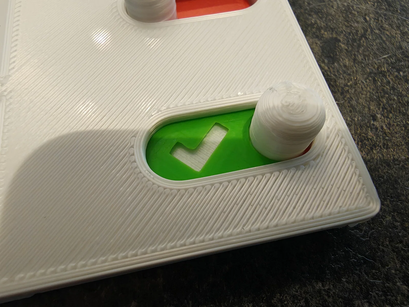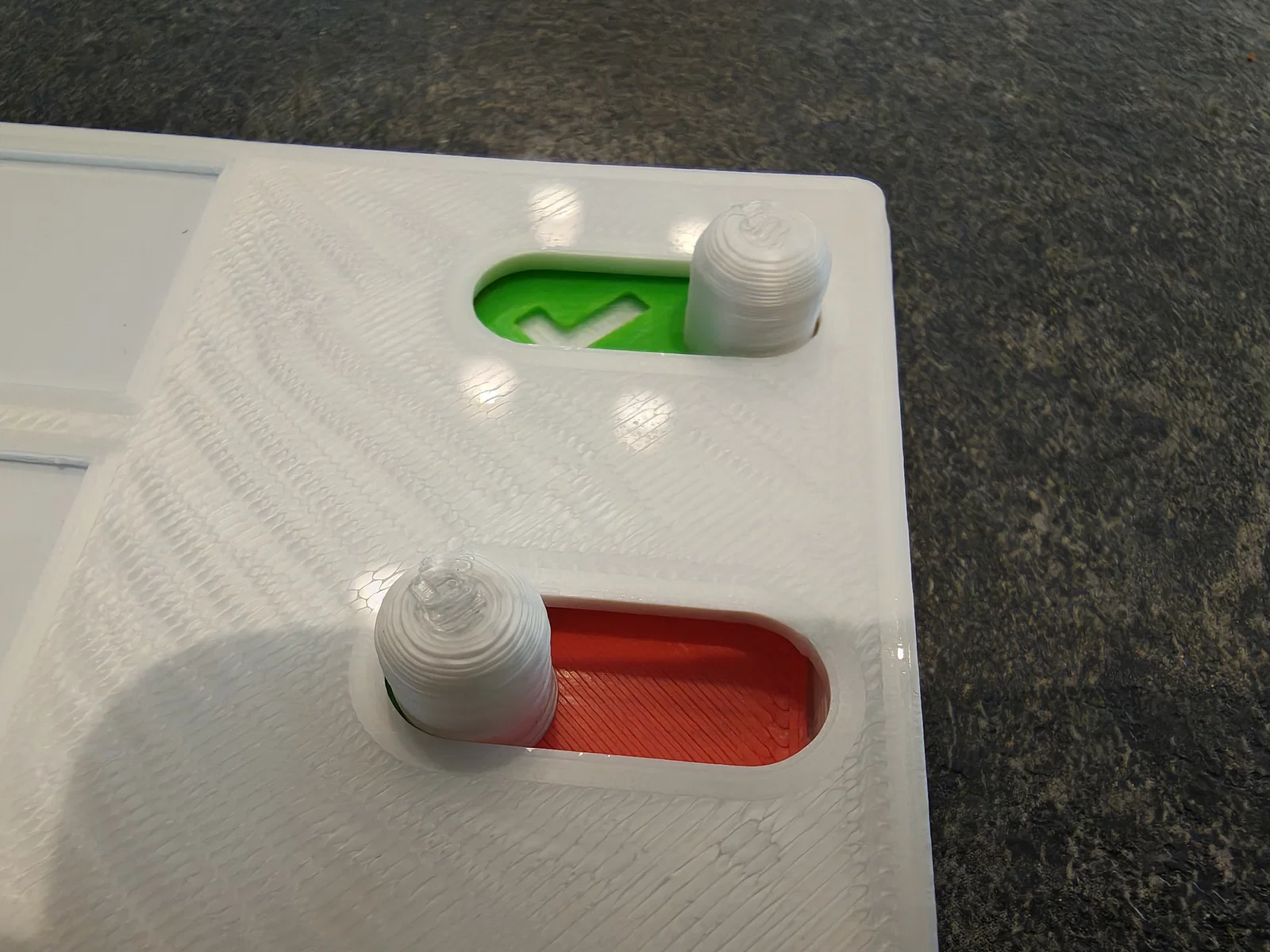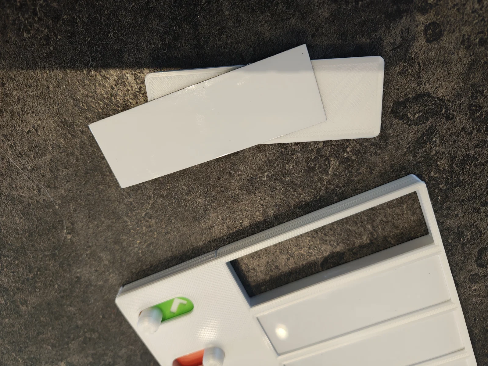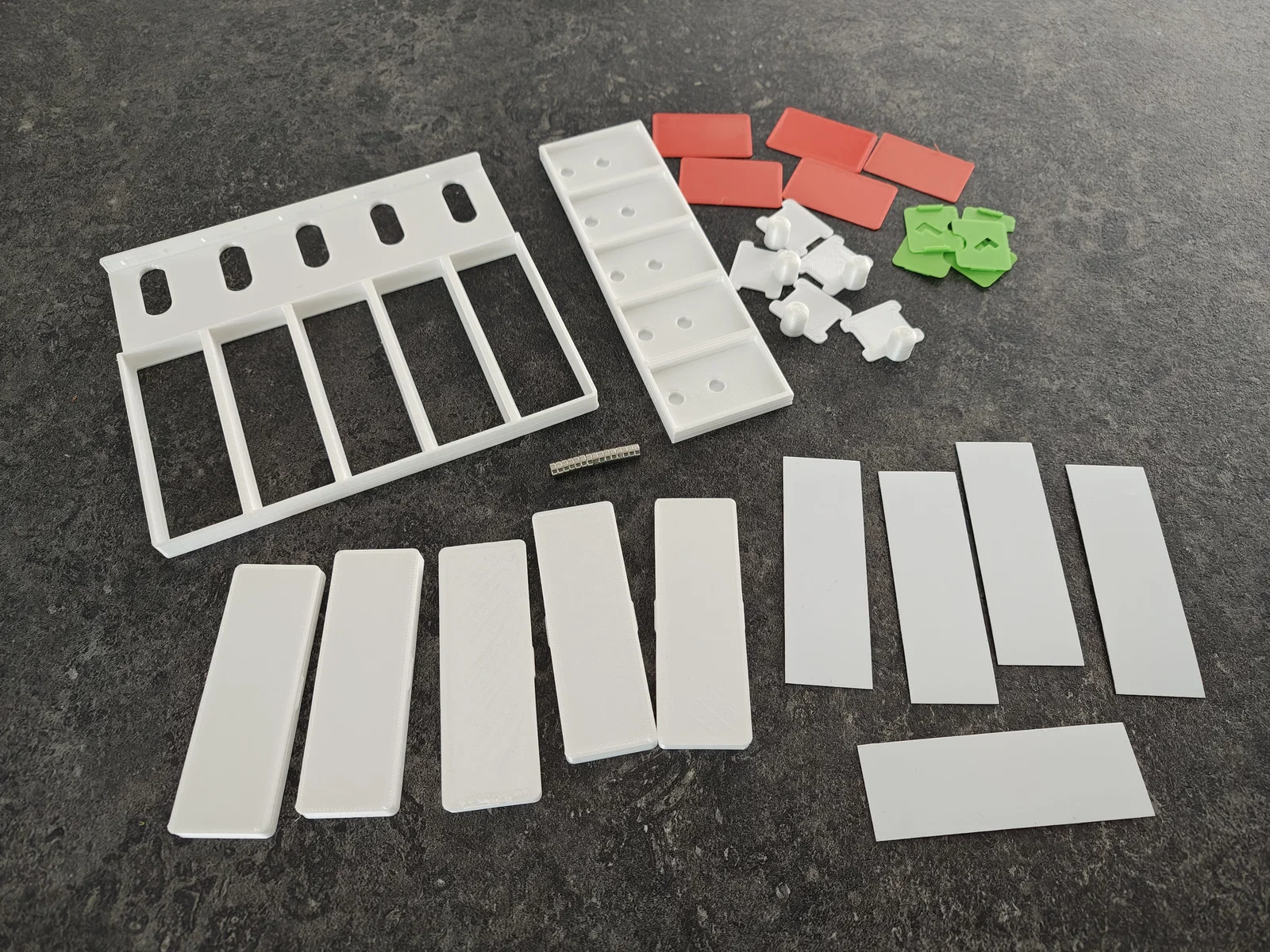 Tất cả các bộ phận đều có thể in được mà không cần hỗ trợ (support) và không cần phải đổi màu nhựa khi đang in. Bạn chỉ cần chuẩn bị nhựa màu đỏ, xanh lá và một màu khác cho phần thân. Dung sai (tolerances) cực kỳ quan trọng để đảm bảo cơ chế đóng mở của cần gạt dấu tích hoạt động mượt mà.