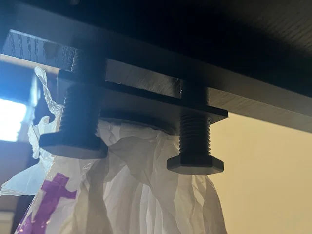 Một chiếc giá treo túi rác được thiết kế để gắn vào cạnh bàn hoặc mép bàn làm việc bằng ốc vít.