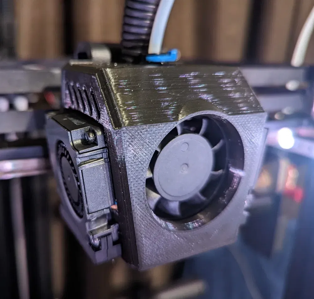 Vỏ/nắp đầu nóng Ender 7 thay thế với một vài điều chỉnh. Lưới quạt đầu nóng đã được loại bỏ, và lỗ mở đã được làm lớn hơn và di chuyển lên trên. Hy vọng điều này cải thiện lưu lượng không khí và giảm tiếng ồn. Một số lỗ thông hơi bổ sung cũng đã được thêm vào trên đỉnh.