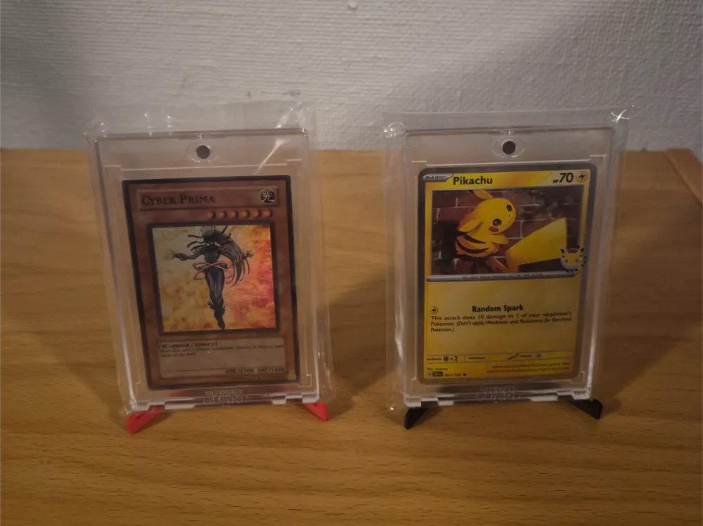 - Lời khuyên sử dụng: Mẫu giá đỡ này hoạt động tốt nhất với các loại thẻ đã được bọc trong case nhựa cứng (toploader) để đảm bảo độ dày và trọng tâm cân bằng khi đặt lên chân đế.