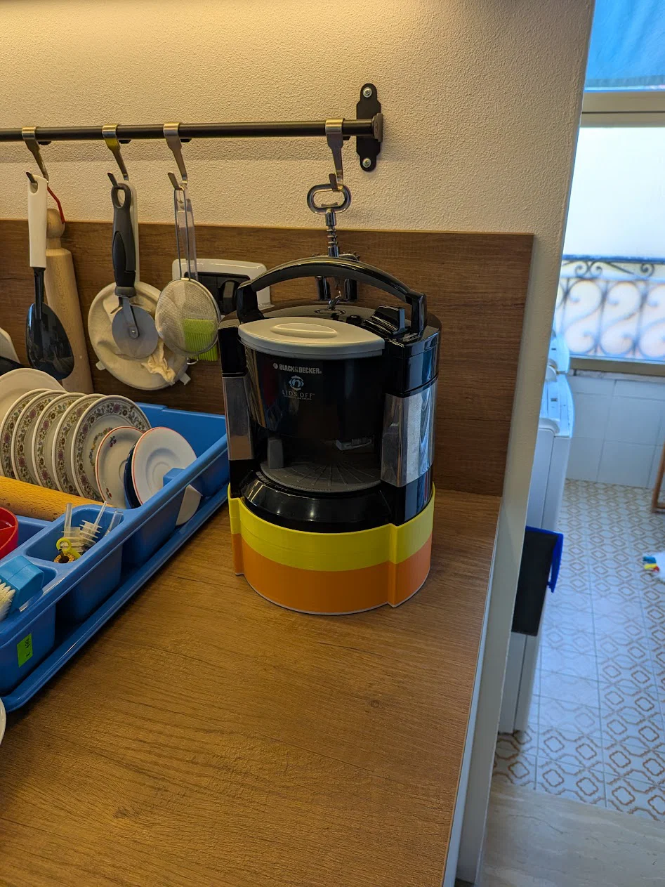 Giải pháp đế in 3D tinh tế để tích hợp bộ chuyển đổi điện áp 110V-220V ngay dưới máy mở nắp hộp Black & Decker Lids Off, giúp mặt bàn bếp của bạn gọn gàng và thẩm mỹ hơn.