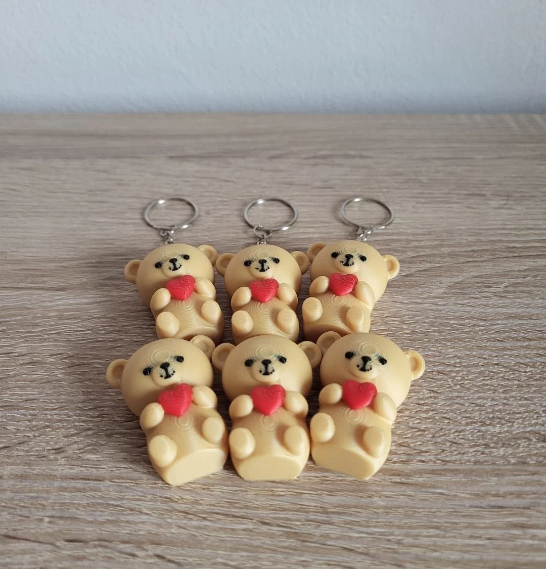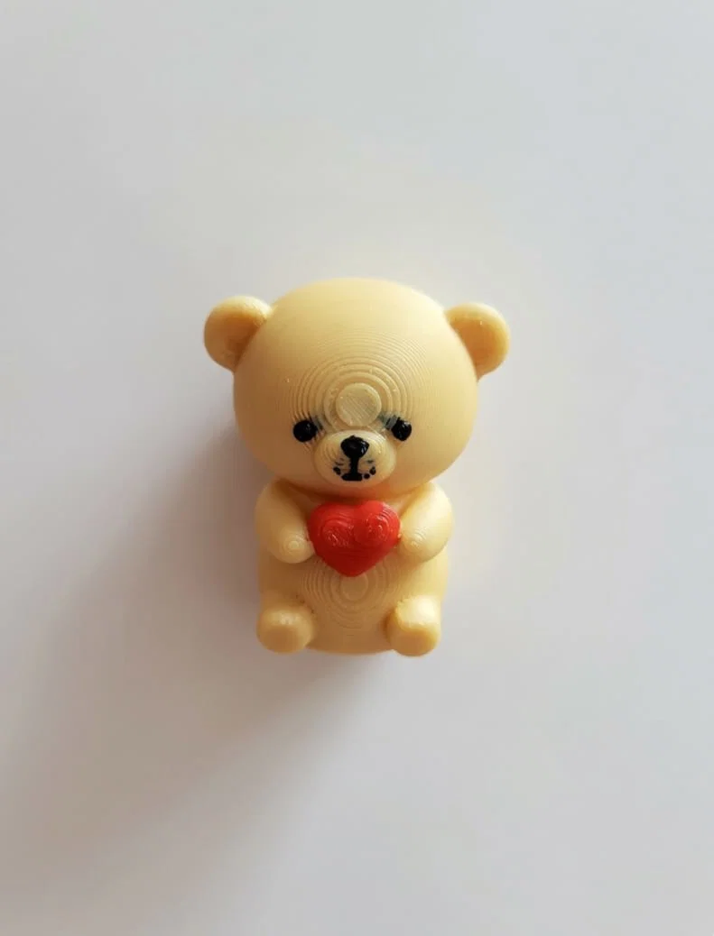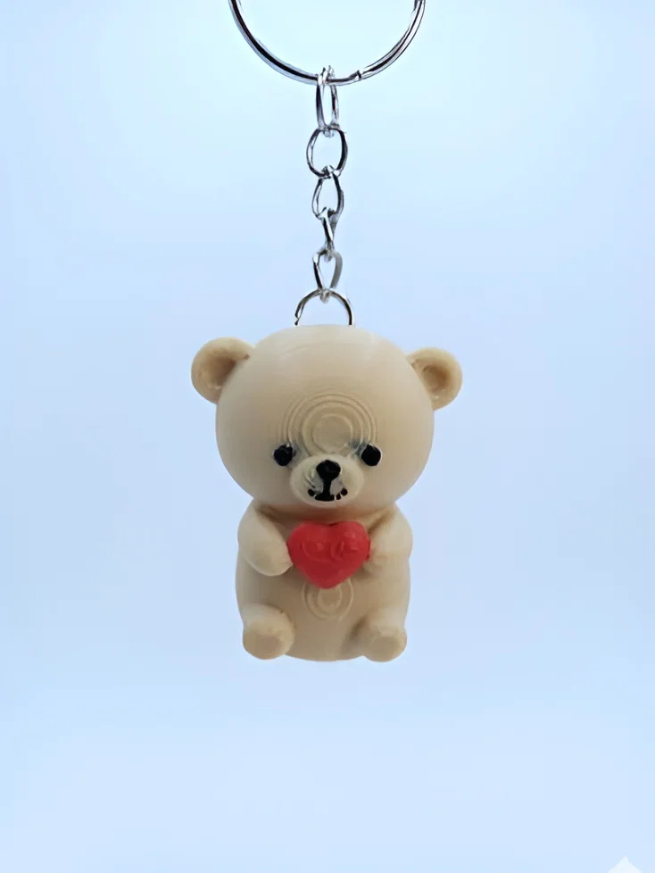 Chú gấu nhỏ dễ thương đang ôm một trái tim. Bạn có thể dùng em nó làm móc khóa, mặt dây chuyền hoặc nam châm dán tủ lạnh cực vui nhộn. Điểm đặc biệt nhất là khi có hai chú gấu gắn nam châm, chúng có thể dính chặt vào nhau. Lưu ý quan trọng: Nếu bạn muốn làm nam châm, hãy nhớ chỉnh tỉ lệ (scale) cái lỗ trong phần mềm slicer sao cho vừa khít với kích thước nam châm của bạn nhé.