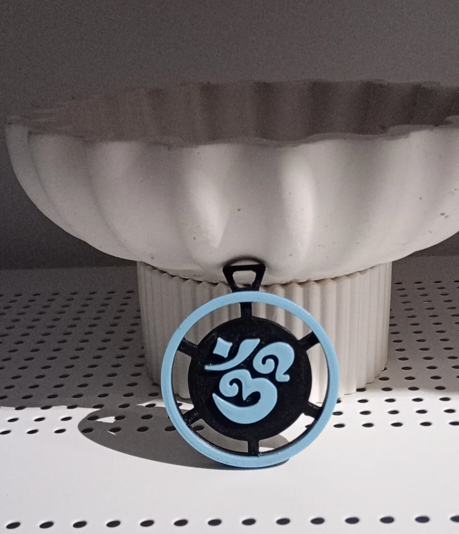 Móc khóa hình biểu tượng thần chú Hindu Om (hoặc Aum) với đường kính 4,5cm và độ dày 6mm. Mẫu in nhỏ gọn, thiết kế tinh tế, dễ dàng in ấn bằng máy in 3D với các thiết lập tối ưu để tạo ra thành phẩm đẹp mắt và bền bỉ.