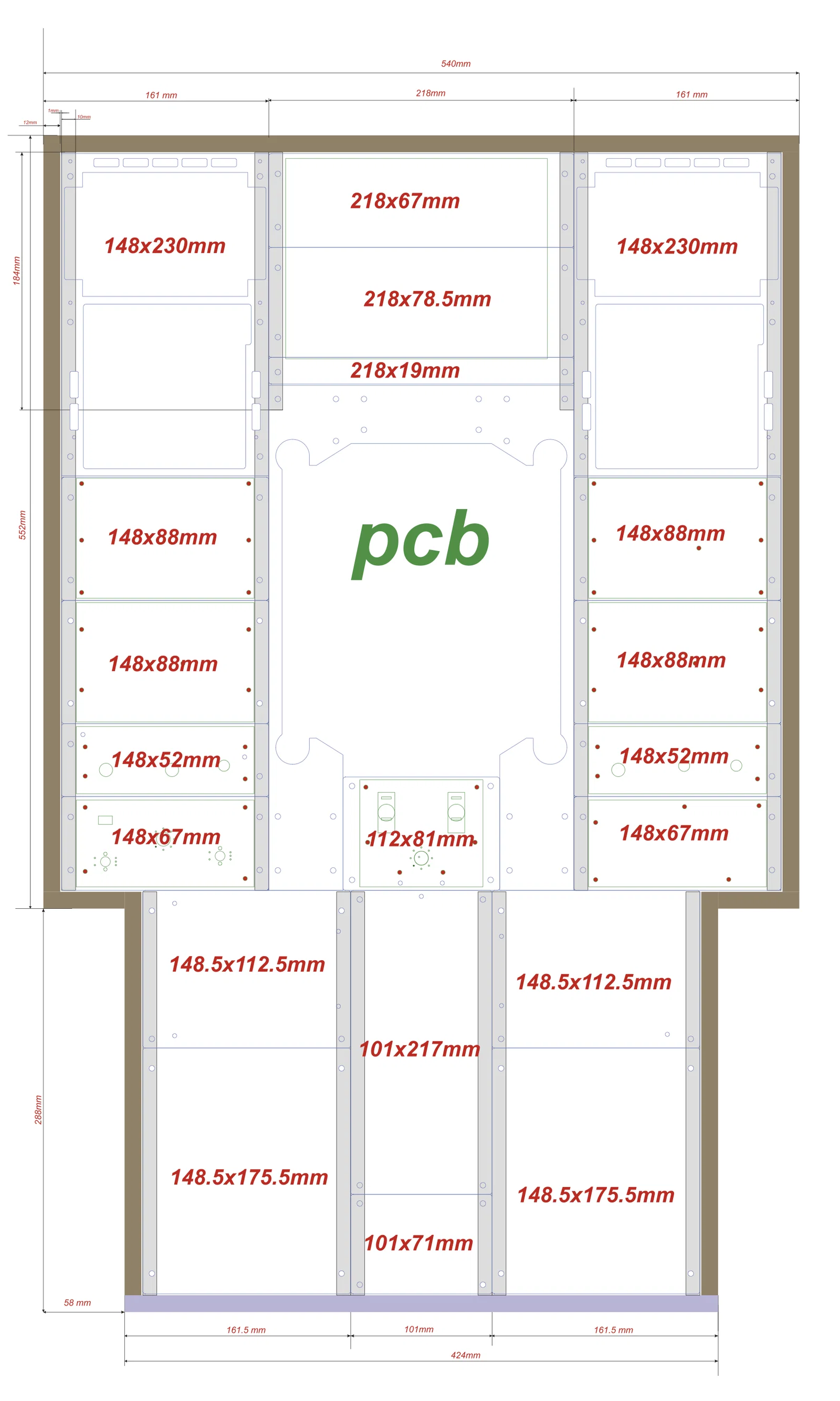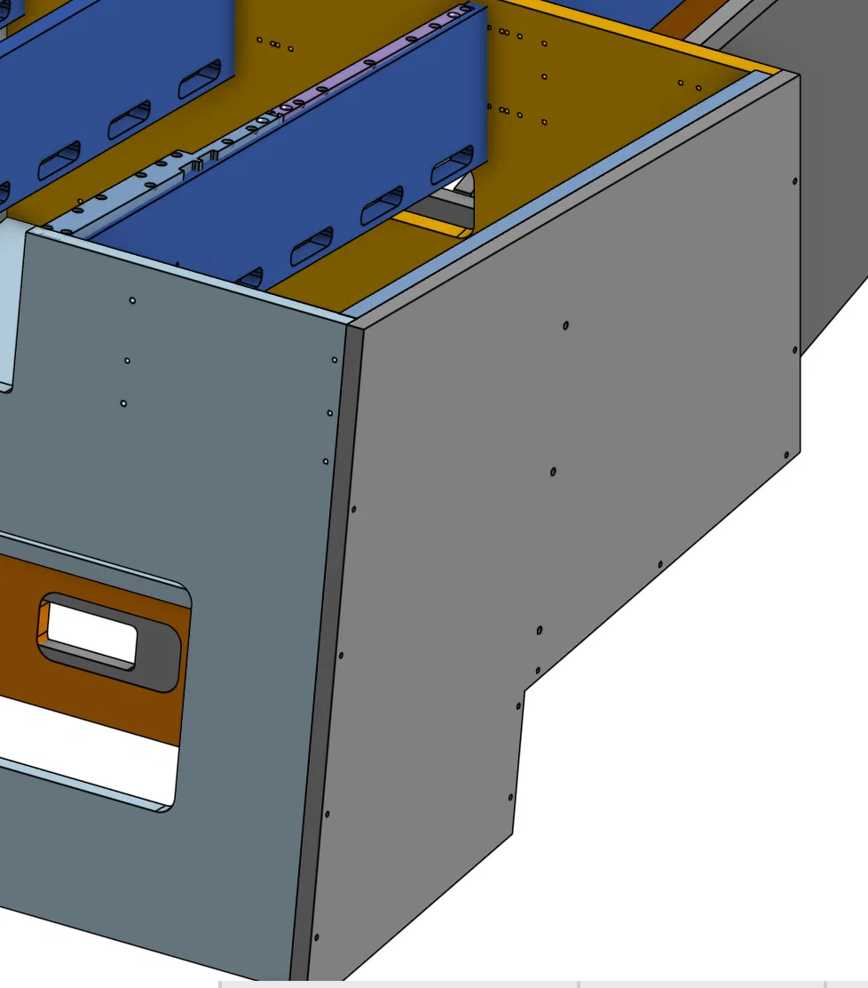 Ví dụ các vòng highlight màu (không rõ tại sao có lỗi hiển thị rendering đó, thực tế các đối tượng không chồng lấn và hiển thị bình thường trong CAD). Tất cả được vẽ trên OnShape. Xem ảnh để biết sơ đồ cách lắp các panel vào thanh ray. Lưu ý bạn cần một thanh ray dưới cho mỗi thanh ray trên (vì chúng giống nhau giữa ray bên và ray chính nên không cần lặp lại).