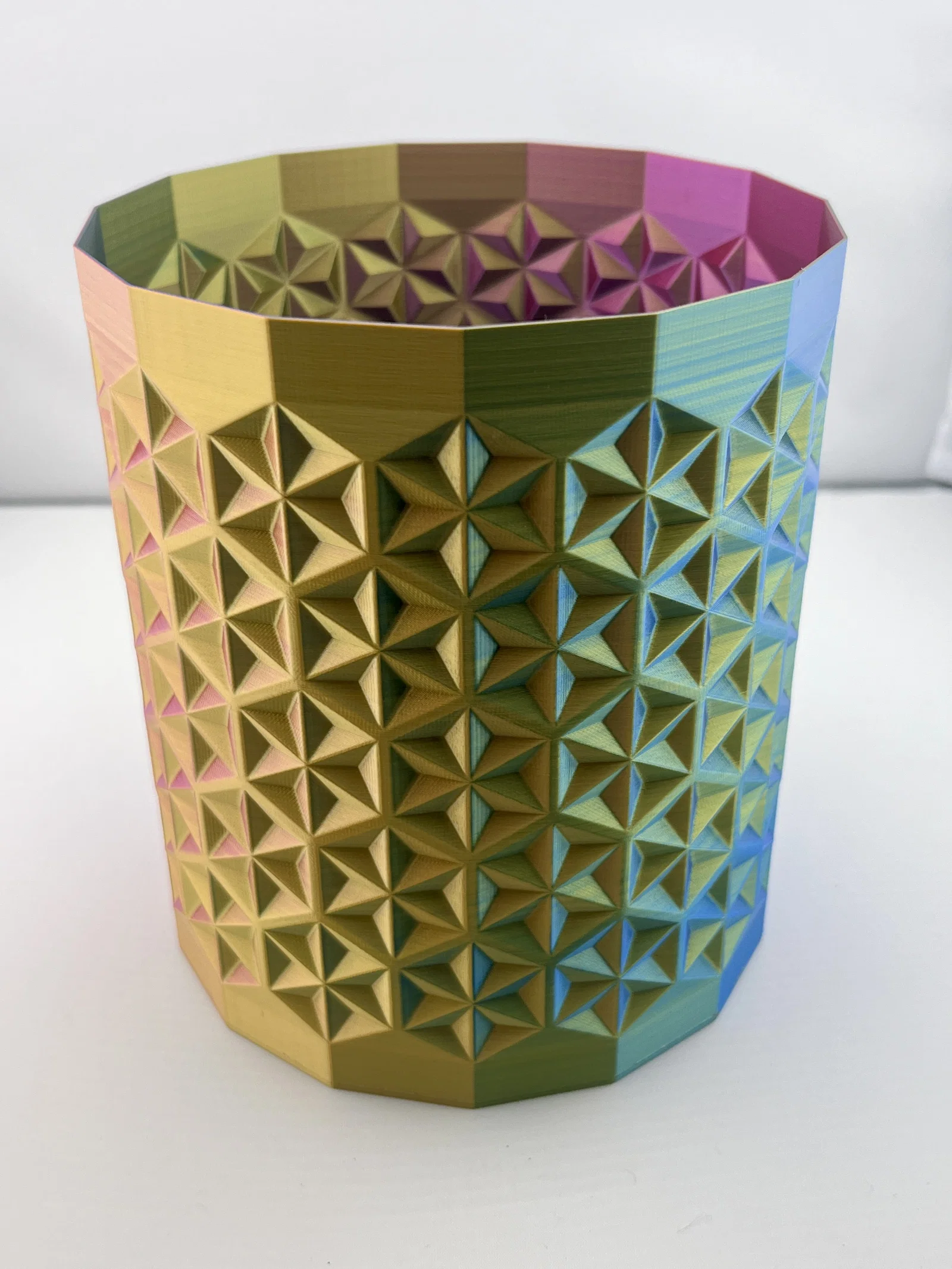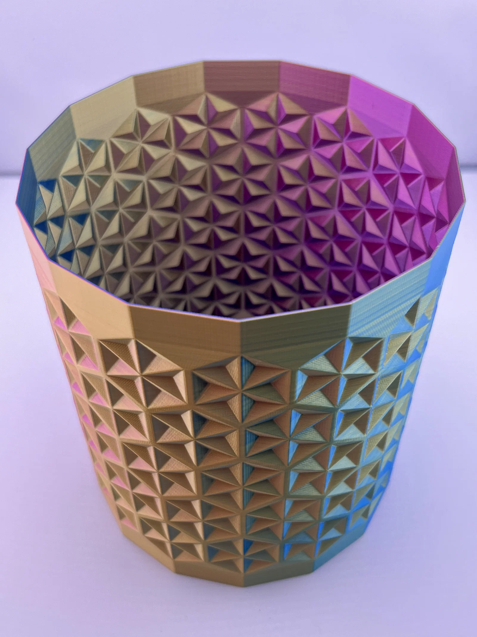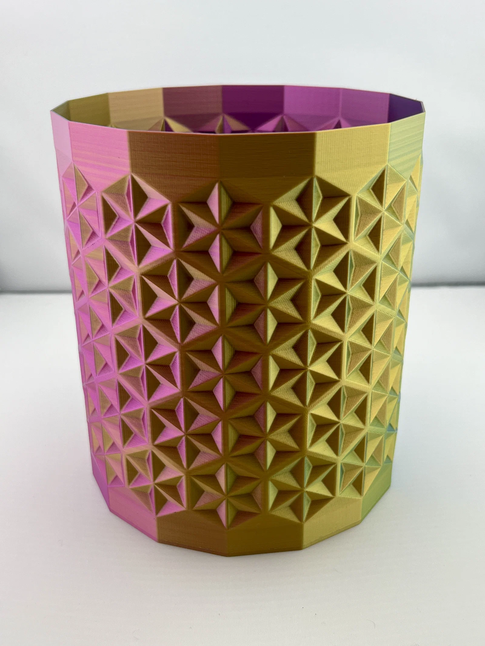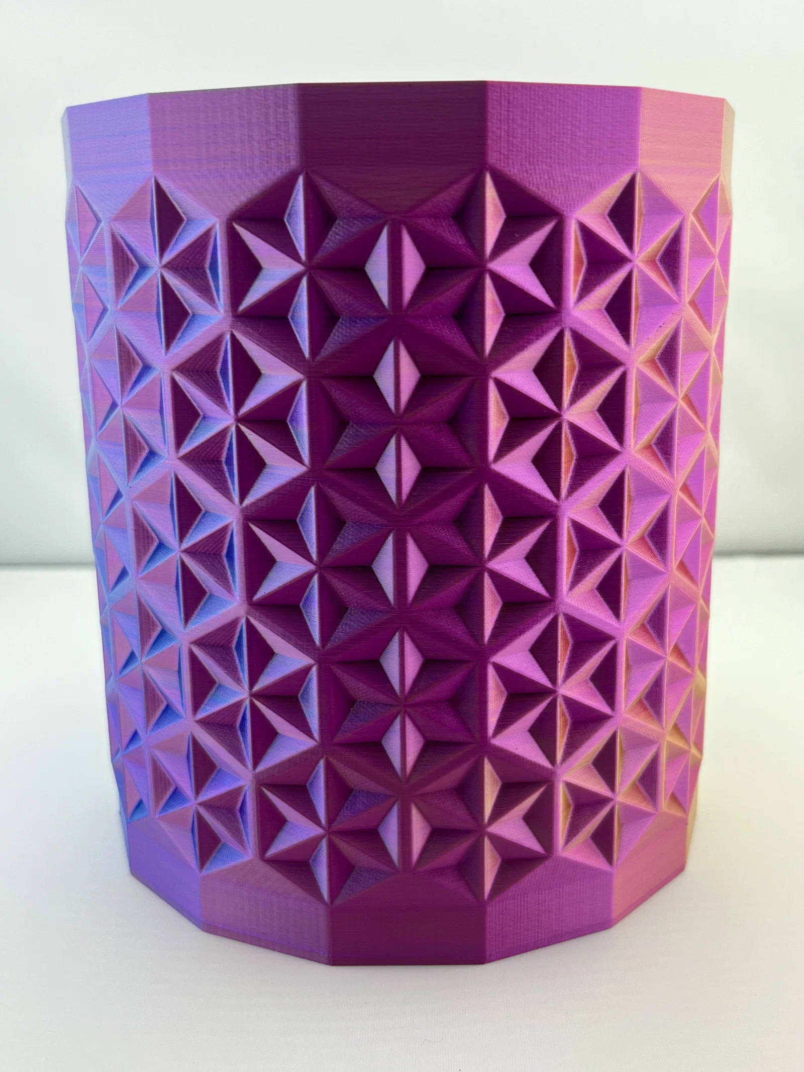 Dạo gần đây mình hơi rảnh rỗi nên muốn tìm gì đó sáng tạo để làm. Mình đã ấp ủ dự định thiết kế chiếc bình đầu tiên từ lâu rồi. Cuối cùng thì mình cũng làm được, mình sử dụng họa tiết Asanoha đa diện, hay còn được gọi là họa tiết lá gai dầu. Nói theo ngôn ngữ hình học thì đây chính là kiểu lát gạch hình lục giác với cấu trúc ngôi sao. Bạn có thể tự chỉnh kích thước cho phù hợp với nhu cầu trong phần mềm slicer nhé :) Mình đã in thử với kích thước bằng 30% so với bản gốc. Hãy in ở chế độ vase mode với chiều cao lớp 0.2mm, đầu phun 0.4mm và độ rộng đường in 0.8mm. Mình sử dụng loại Eryone Tripple Color Filament màu Vàng, Xanh dương & Tím để in sản phẩm này.