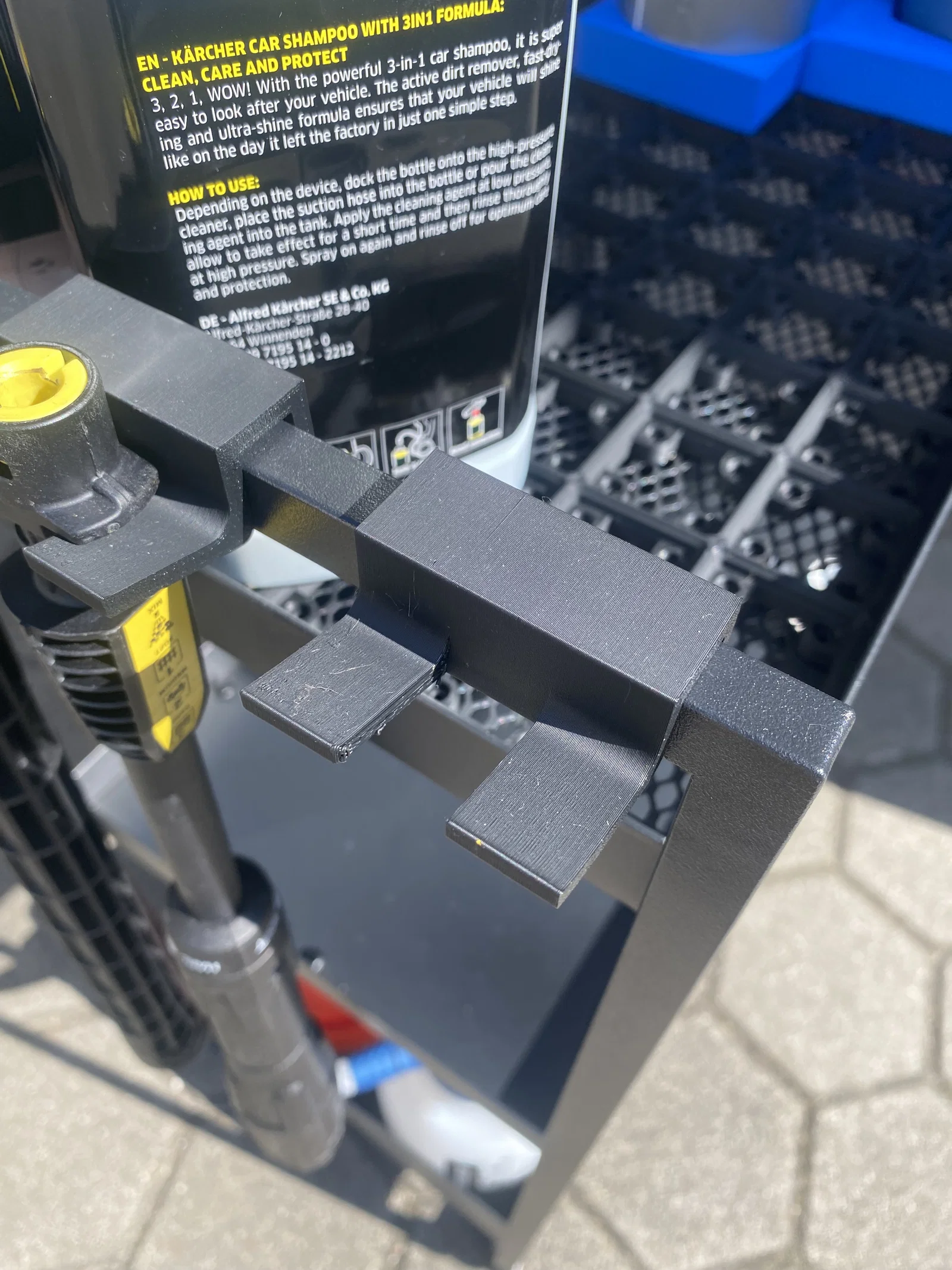 Móc treo cho xe đẩy IKEA Nissafors. Mình dùng cái này để làm xe đẩy chuyên dụng cho việc chăm sóc xe (car detailing). Nó hoạt động rất hiệu quả, bạn có thể treo thẳng 90° hoặc cao hơn 2mm để tạo góc nghiêng, giúp nước chảy thẳng xuống sàn thay vì đọng lại trên xe. Mình in bằng nhựa PLA vì sẵn có từ dự án trước, và thấy dùng vẫn ổn. Tuy nhiên, nếu bạn định để ngoài trời hoặc nơi có nắng gắt, mình khuyên nên dùng nhựa PETG, ABS hoặc ASA cho bền. Móc này tương thích với tất cả các phụ kiện Karcher có khớp nối nhanh (quick release).