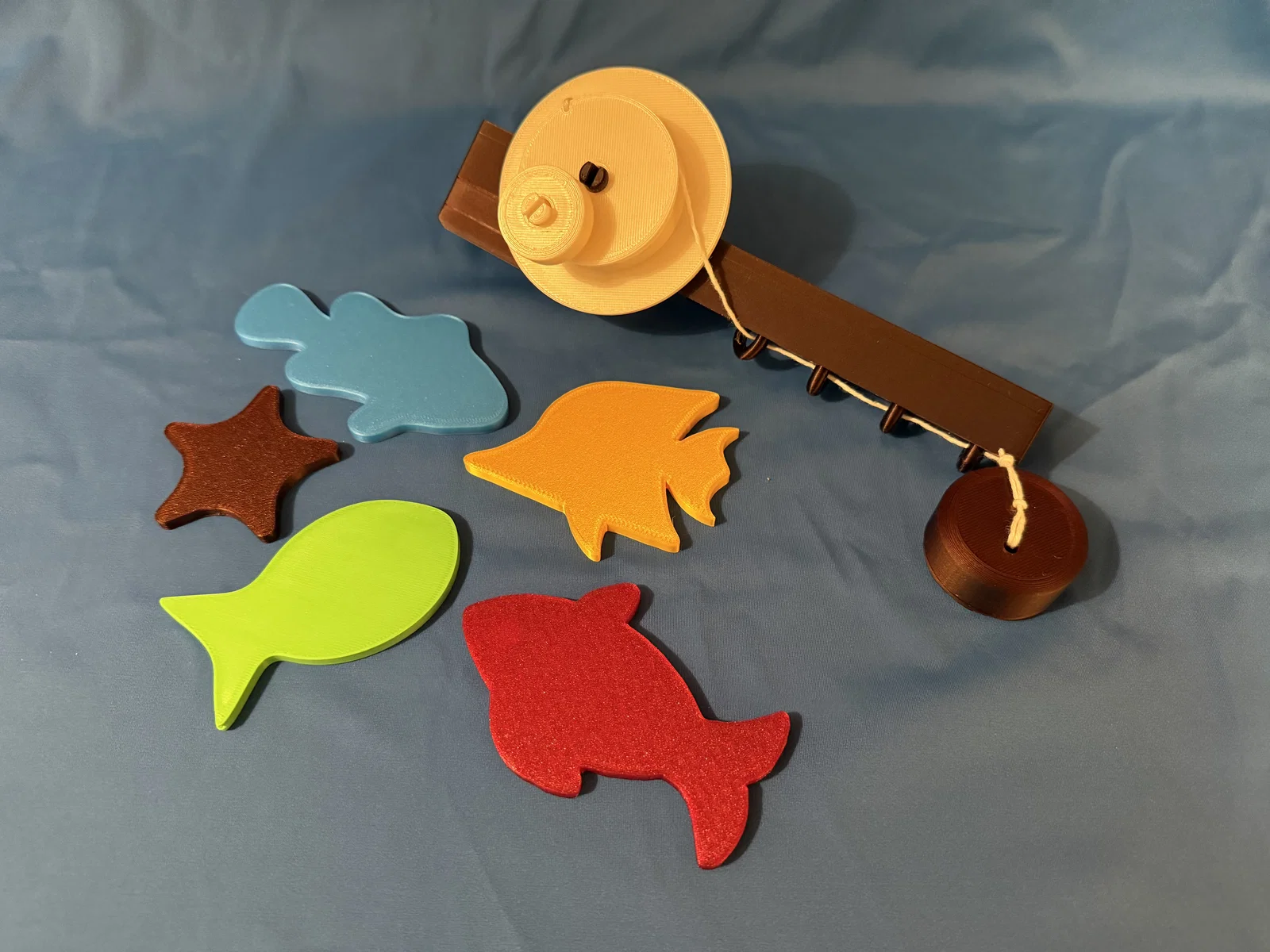 Cần câu có hai phiên bản - một loại có máy quay và một loại không. Cả hai đều có nam châm ở tay cầm để cất giữ gọn gàng hơn - bạn có thể gắn móc câu vào tay cầm để nó không bị đung đưa lung tung. Máy quay hoạt động hoàn toàn bình thường - nó được làm từ hai phần: thân máy quay và tay cầm. Nam châm được bao bọc hoàn toàn bên trong các bản in nên không thể nào rơi ra ngoài được. (Tin mình đi, mình đã thử rồi, phải bỏ đi mấy cục nam châm trong lúc kiểm tra đấy 🫠). Vậy nên khá an toàn cho trẻ nhỏ. Tuy nhiên, vẫn nên cẩn thận vì nam châm không phải là món đồ chơi để nhai đâu nhé.