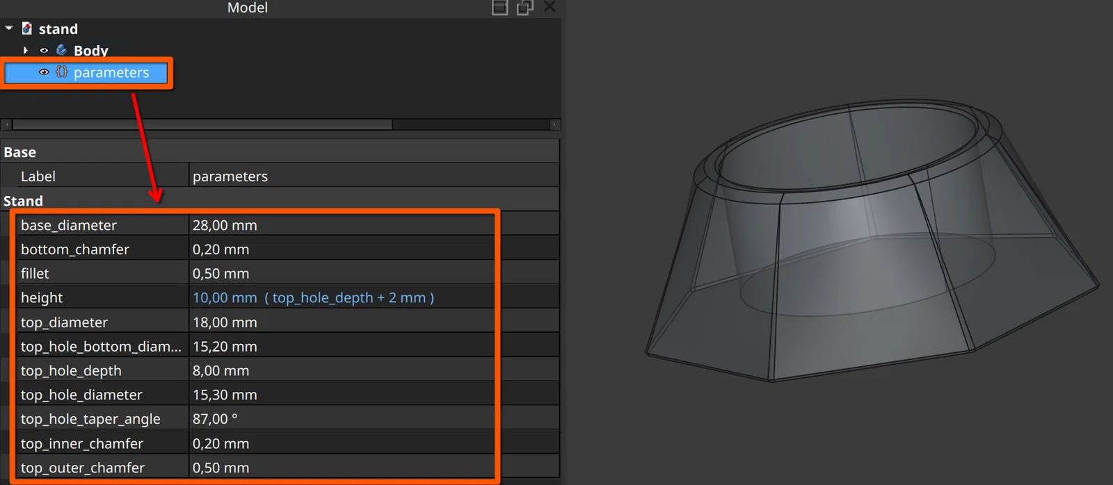 Để tùy chỉnh thông số mô hình, bạn hãy tải về và mở file bằng FreeCAD, sau đó sửa trong phần parameters: