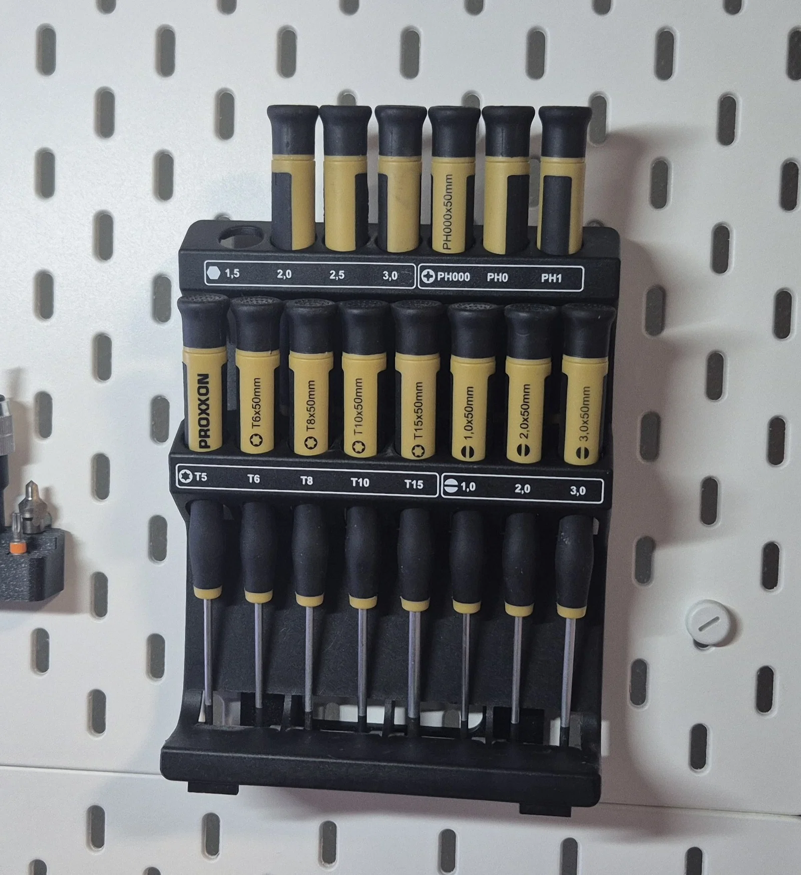 Adapter tiện lợi giúp bạn treo gọn bộ tua vít Proxxon lên bảng Skadis của mình. Cần chuẩn bị thêm ốc M3 và đai ốc vuông để lắp ráp. Có thể in bằng PLA hoặc PETG, tùy loại máy in mà bạn cân nhắc thêm support nhé.