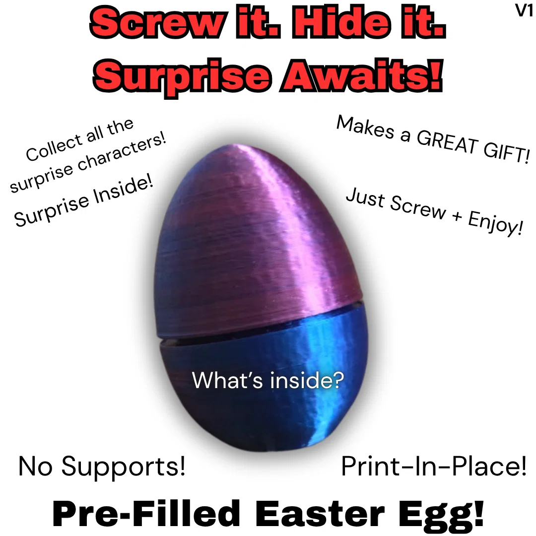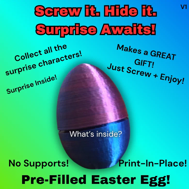 Đặc điểm nổi bật: • Thiết kế in liền khối (print-in-place) với cơ chế xoay vặn tích hợp • Không cần sử dụng support • Thao tác xoay mở để lộ nhân vật bất ngờ bên trong • Tuyệt vời để làm quà tặng, trang trí trong các cuộc săn trứng Phục Sinh hoặc làm vật phẩm sưu tầm • In nhanh, ổn định trên hầu hết mọi dòng máy in FDM • Ren xoay được tinh chỉnh để mở dễ dàng ngay sau khi in xong