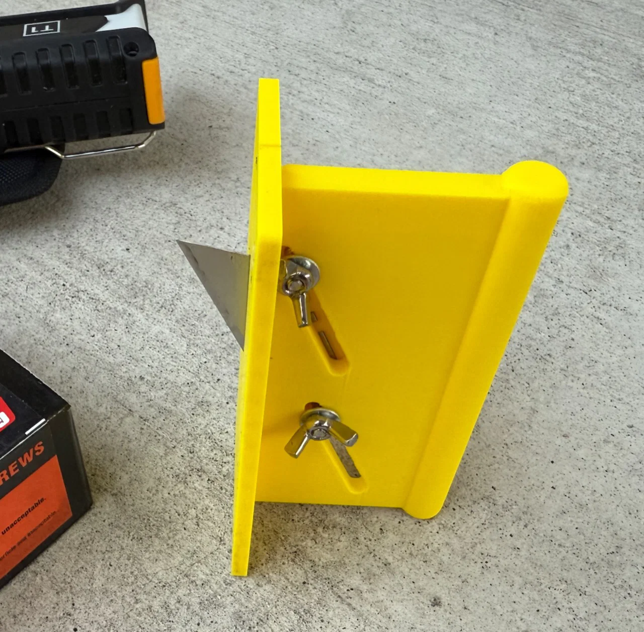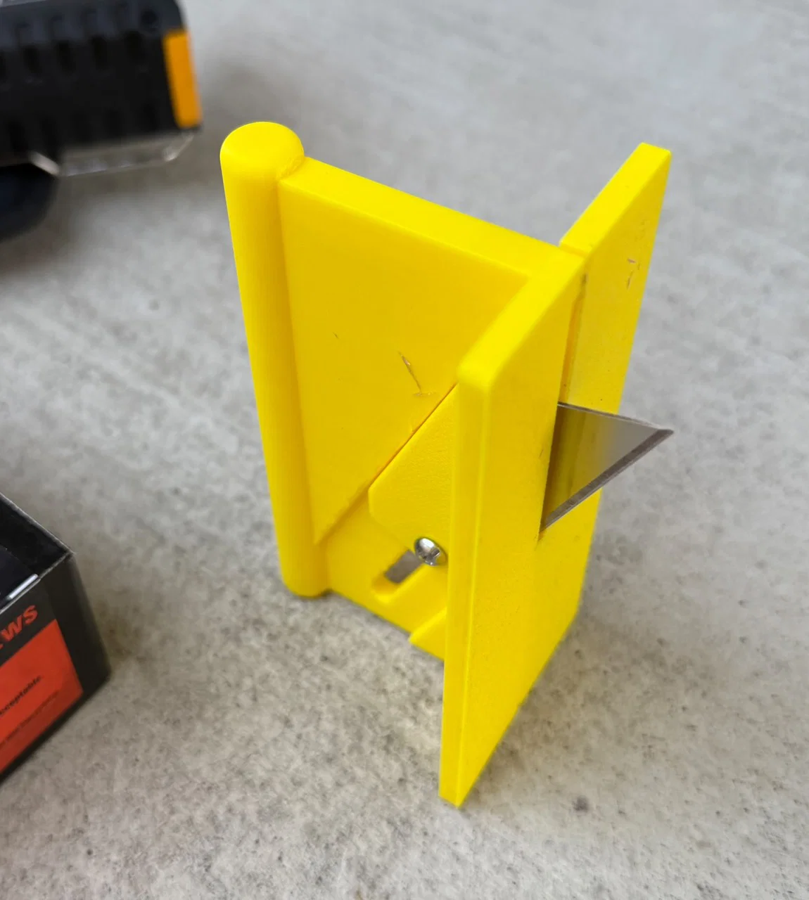 Công cụ này giúp kẹp chặt lưỡi dao rọc giấy tiêu chuẩn (loại Stanley 11-921) bằng ốc vít, long đền và đai ốc cánh. Bạn có thể nâng hạ lưỡi dao bằng cách nới lỏng hoặc siết chặt đai ốc. Mô hình có thể in mà không cần hỗ trợ (support), dùng bất kỳ loại nhựa nào bạn có (mình dùng PLA tiêu chuẩn).