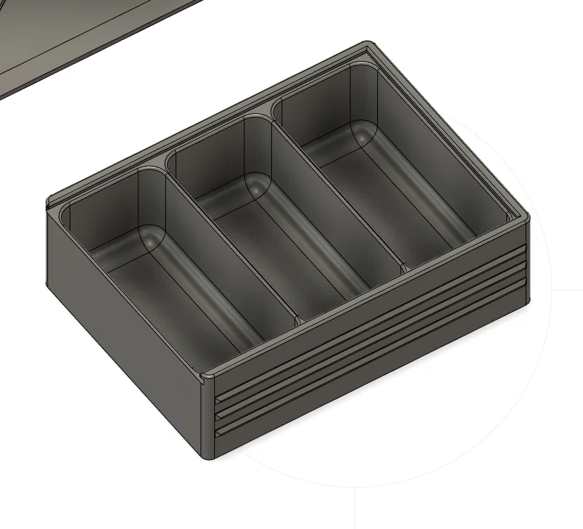 Đây là phiên bản thiết kế lại chuyên nghiệp cho hộp đựng ốc vít của tôi. Hộp gồm ba ngăn riêng biệt với các góc đáy bo tròn, giúp bạn dễ dàng "múc" các linh kiện nhỏ ra ngoài. Phần nắp được gia cố thêm thanh giằng cấu trúc cùng nhãn "FASTENERS" nổi bật. Tôi cũng đã thêm các đường gờ ngang ở hai bên thân hộp để tăng độ bám và độ bền tổng thể khi cầm nắm.