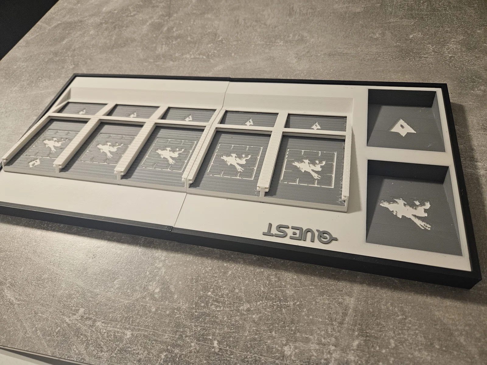 Mình thiết kế những tấm bảng này làm khay giữ thẻ bài cho trò chơi Horizon Zero Dawn, giúp bàn chơi gọn gàng và đẹp mắt hơn. Lưu ý nên dùng nhựa in tan (BVOH/PVA) cho các rãnh thẻ.