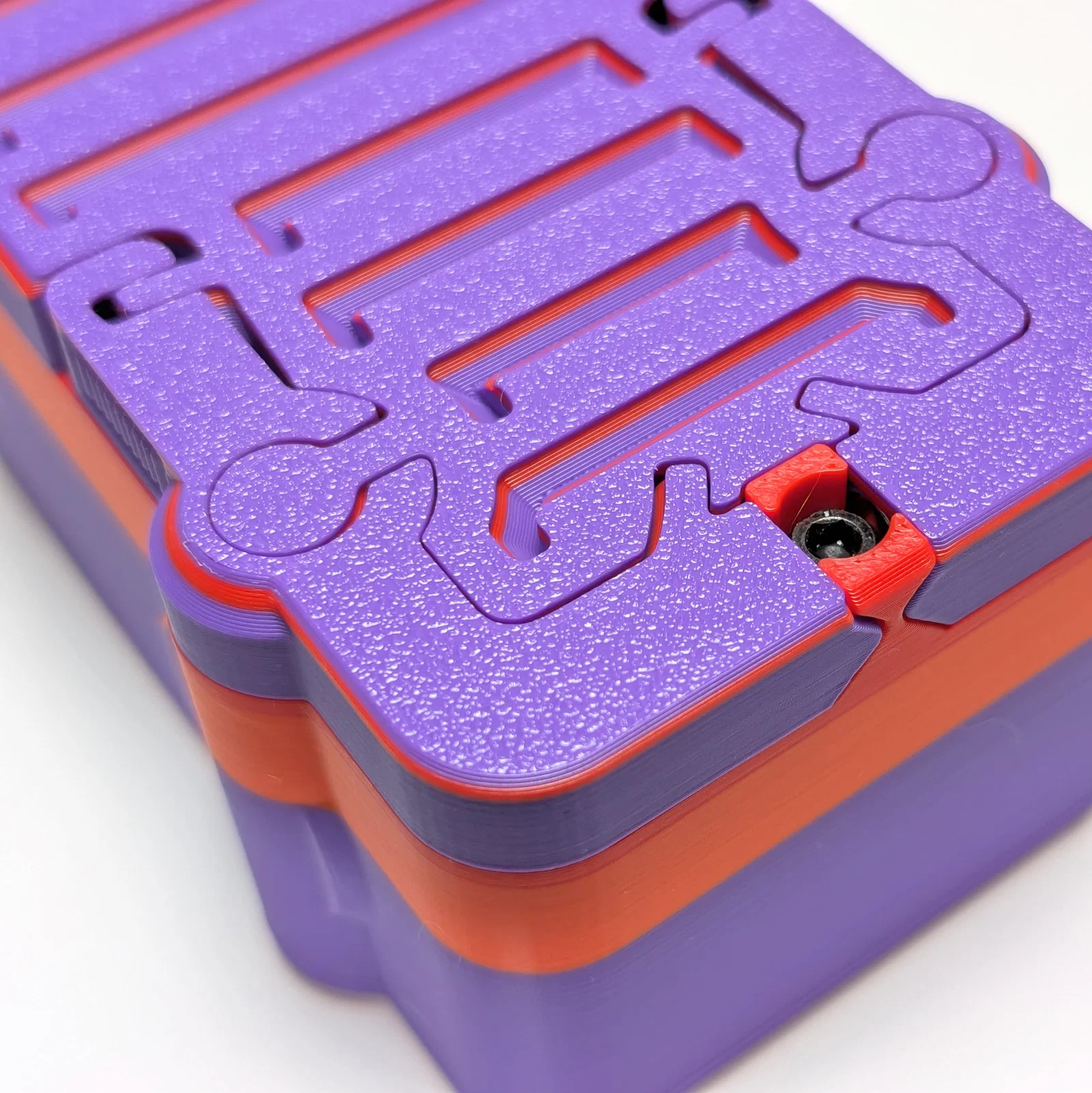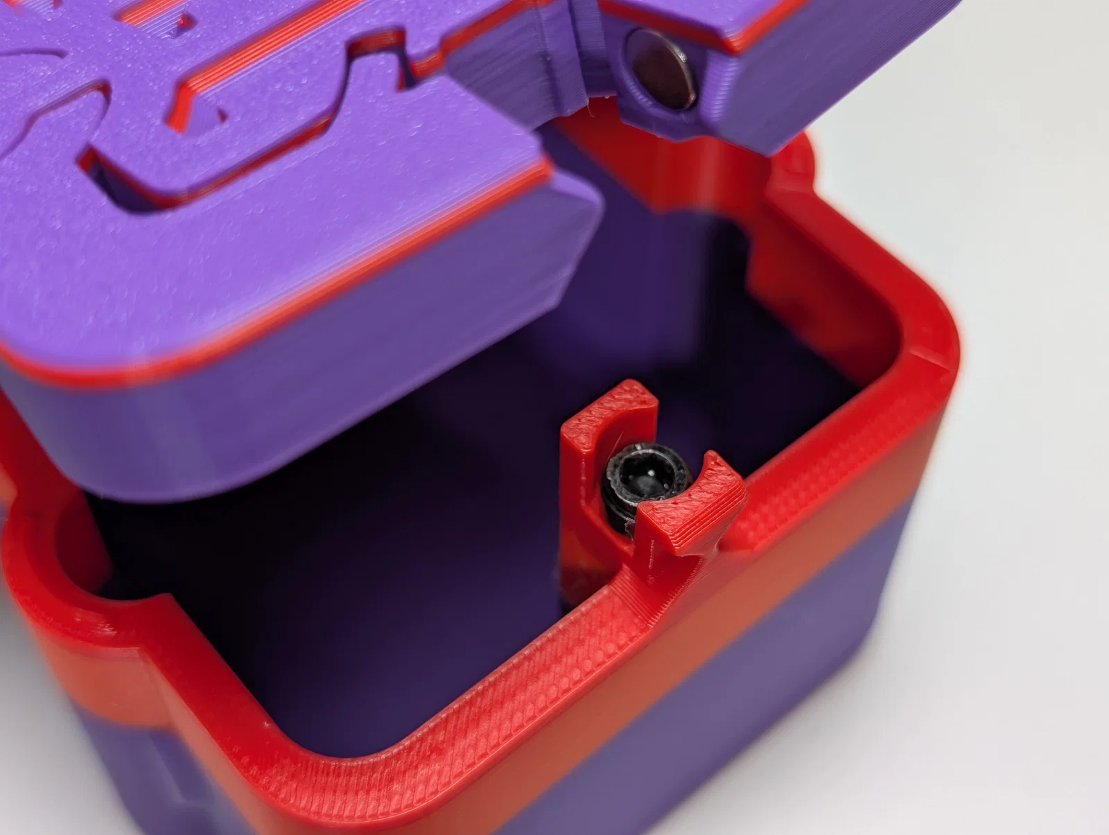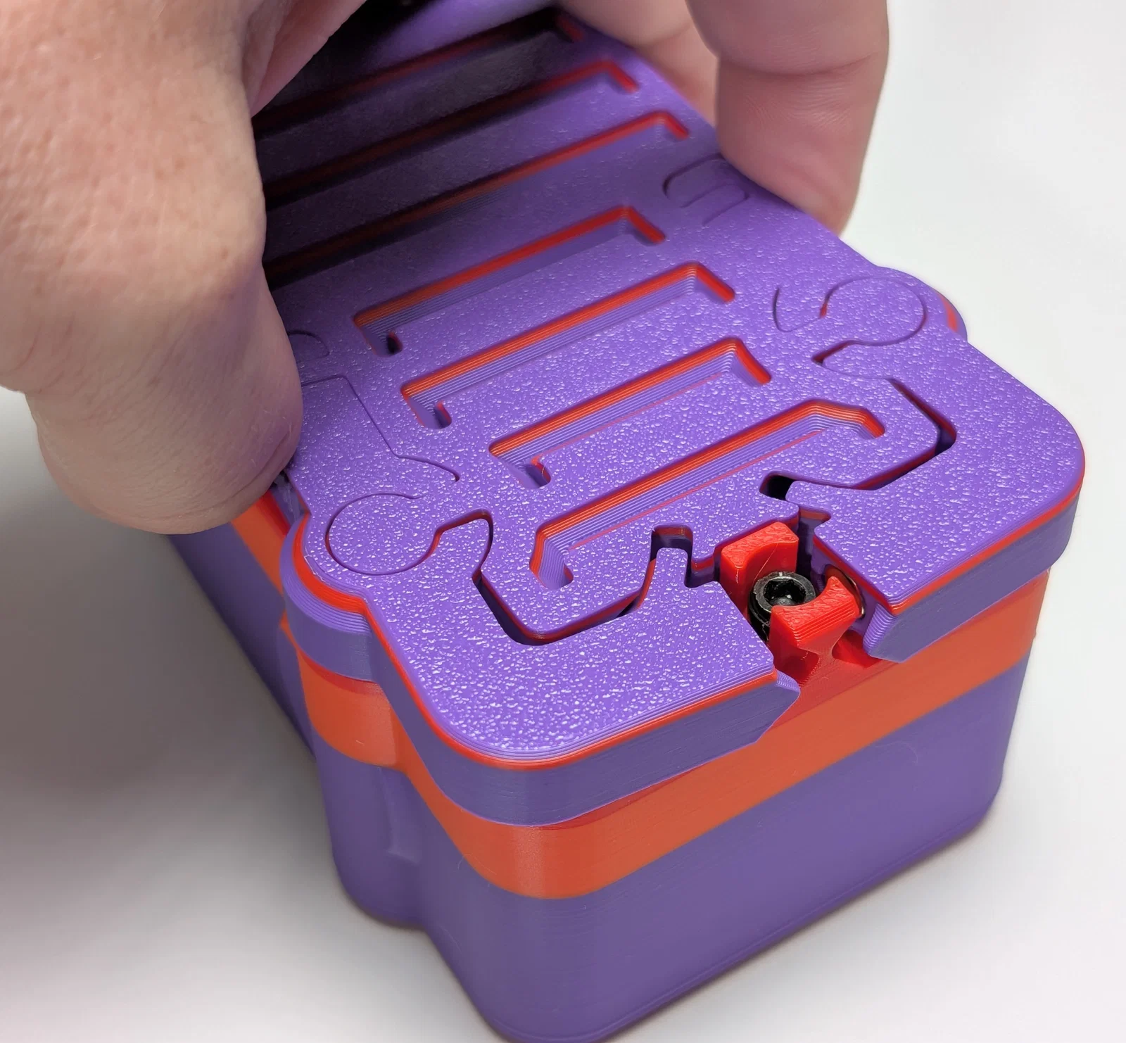Hộp đựng Magnabolt với cơ chế khóa từ tính thông minh, sử dụng lực hút và đẩy của nam châm kết hợp với ốc vít để cố định nắp hộp một cách chắc chắn và mượt mà mà không cần dùng đến support khi in.