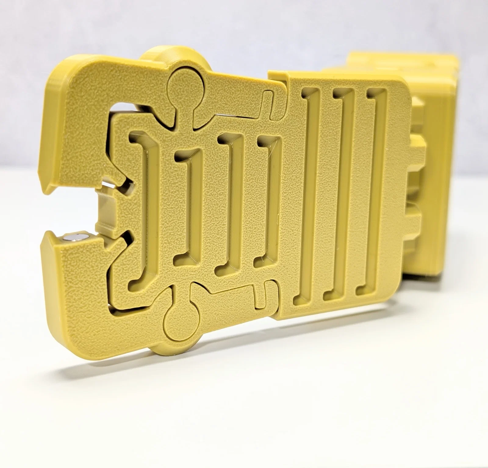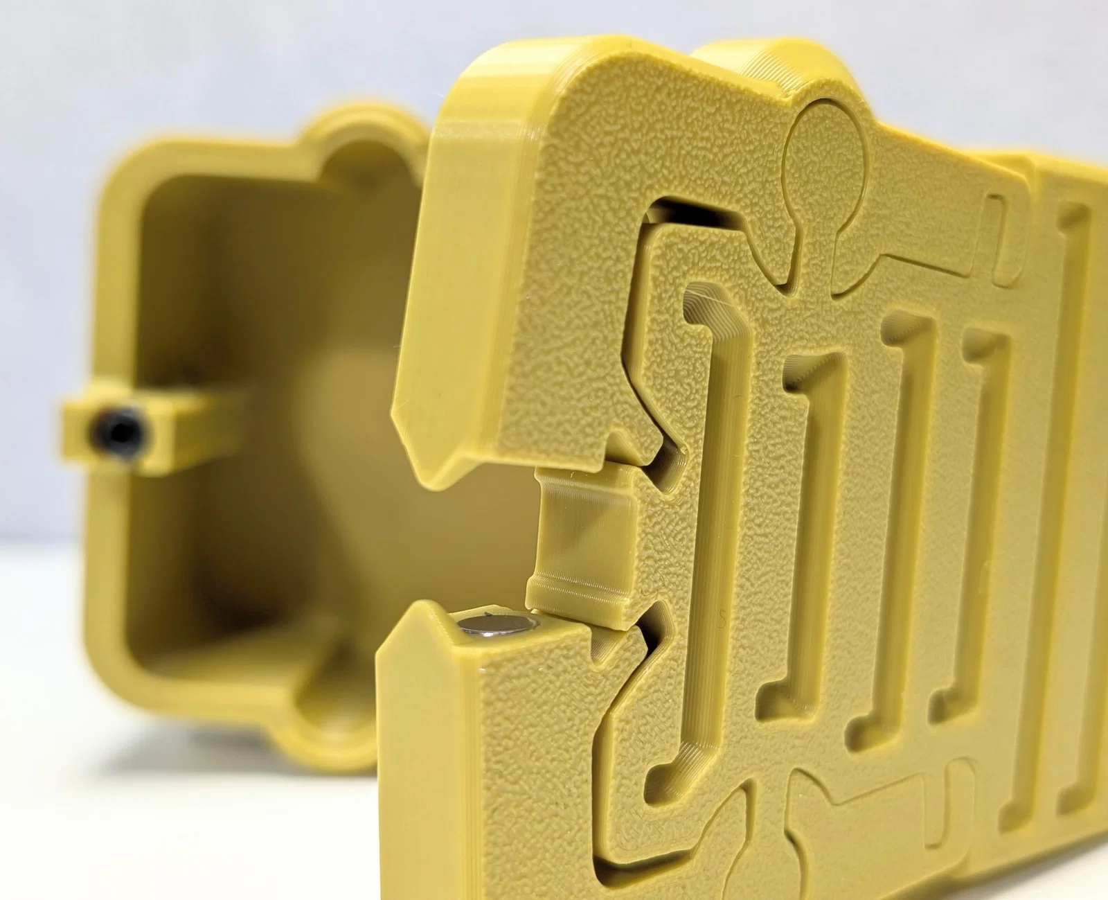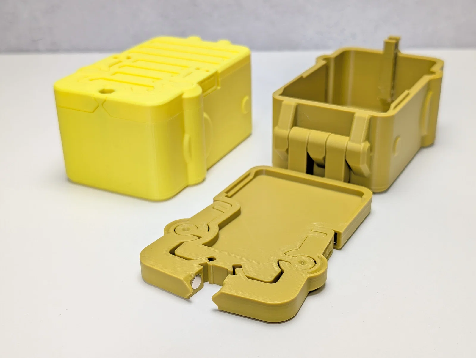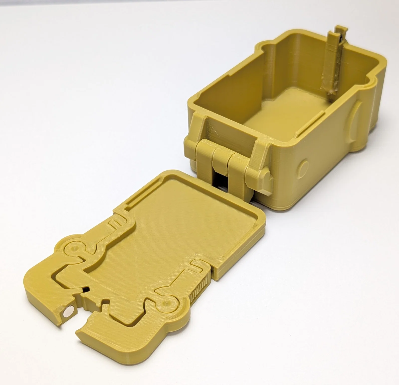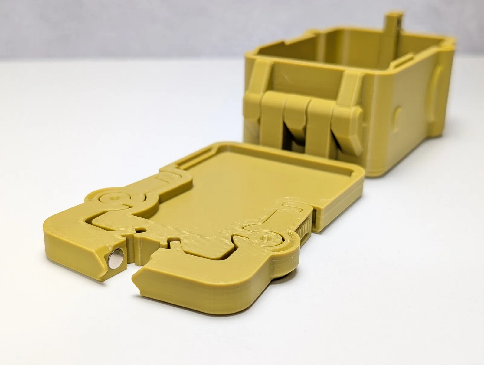 Hộp Magnabolt được in ở trạng thái mở, với cả phần đế và nắp nằm phẳng trên bàn in.