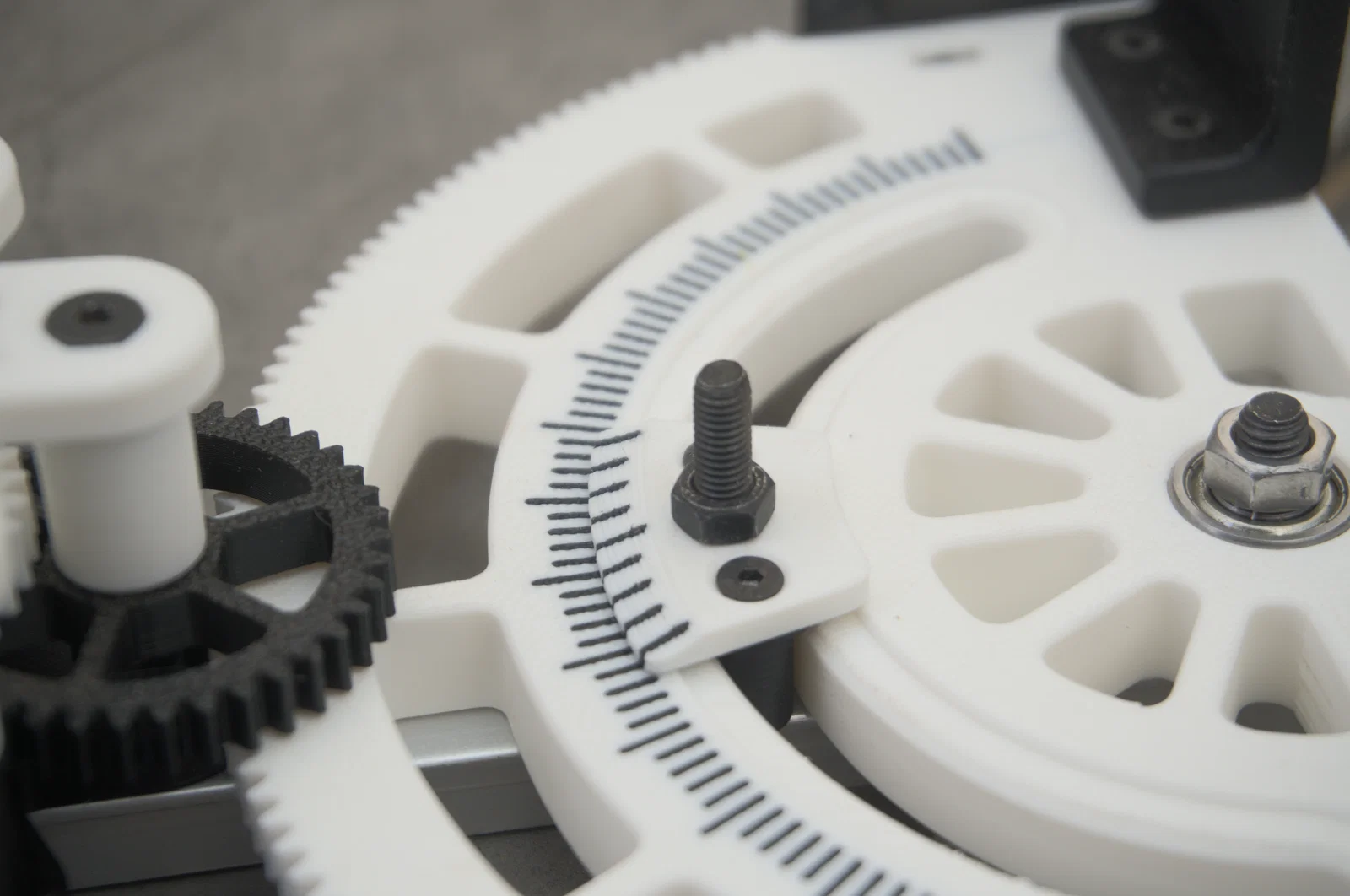 Mô hình này thay thế cơ chế khóa ma sát tiêu chuẩn bằng hệ thống truyền động bánh răng cơ khí. Nhờ tận dụng tỷ lệ truyền bánh răng 10:1 mượt mà, bạn có thể thực hiện các tinh chỉnh siêu nhỏ mà không cần phải gõ nhẹ vào thanh dẫn hướng để canh chỉnh. Thước Vernier tích hợp được tối ưu hóa cho in AMS/đa màu, các vạch dấu có độ tương phản cao được in chìm vào chi tiết nên không bao giờ bị mòn hay bong tróc.