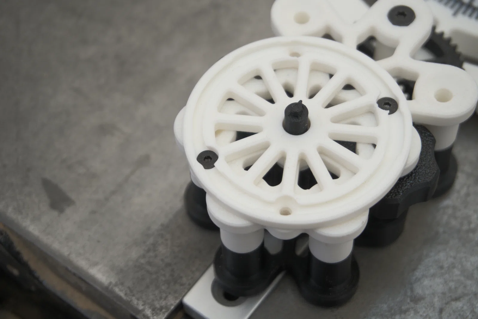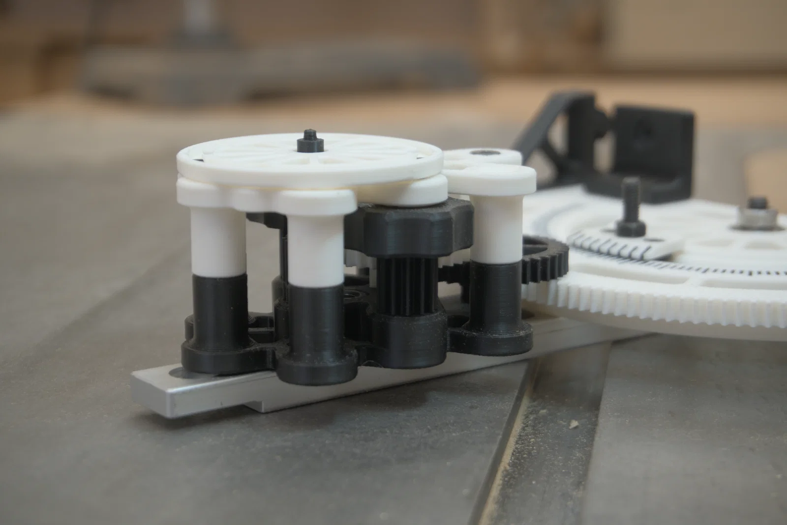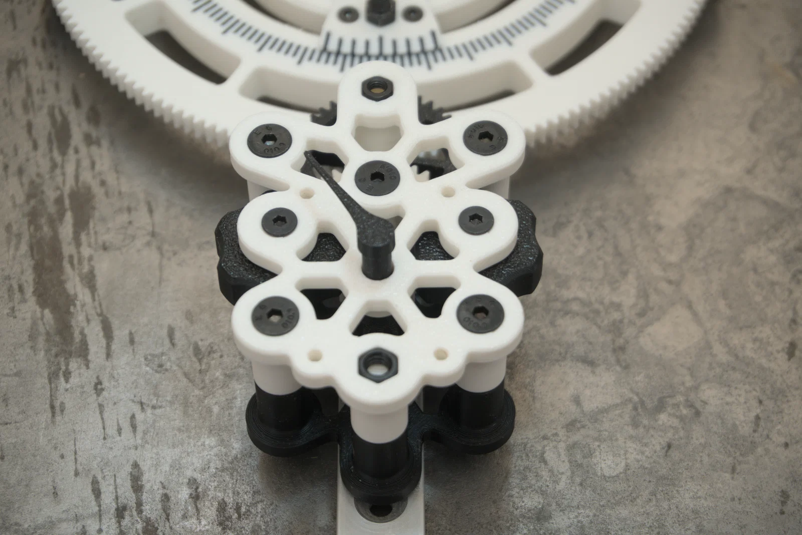 • Hệ thống bánh răng kép 10:1: Sử dụng hệ thống bánh răng thẳng hai tầng (số răng 40/12 và 36/12) được thiết kế đặc biệt để in FDM ổn định mà không làm giảm lợi thế cơ khí. (Module 1mm với đầu phun 0.4mm)