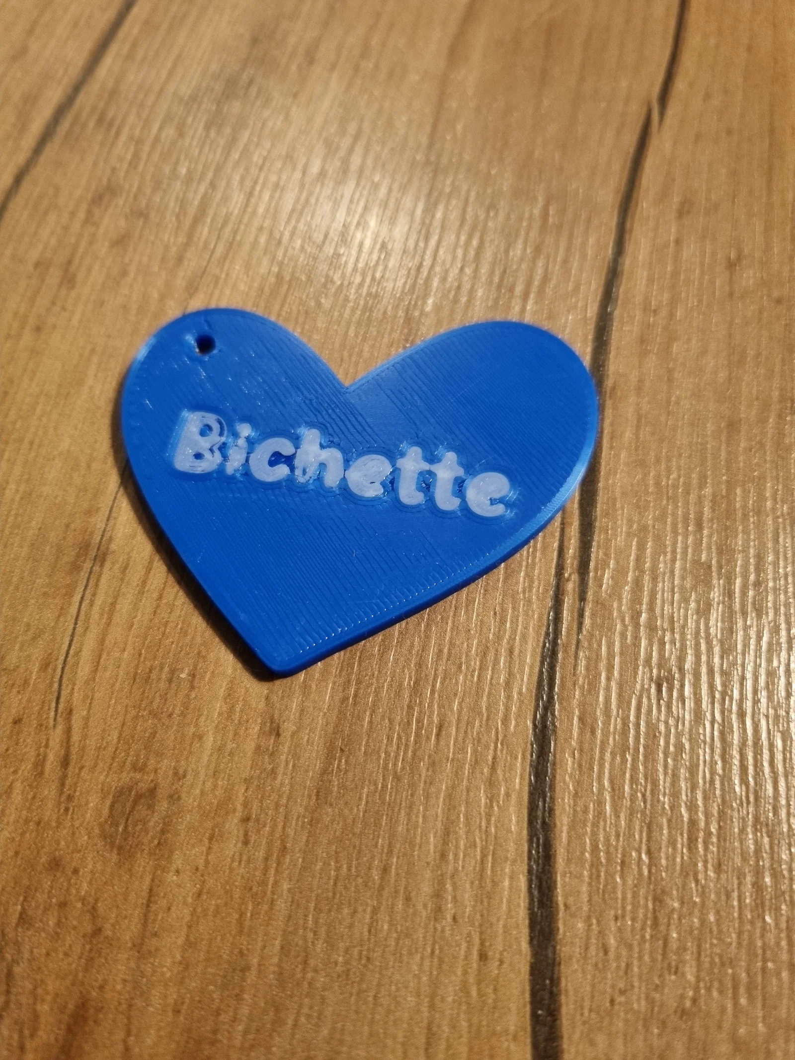 Điểm thú vị của mẫu thiết kế này chính là khả năng kết hợp màu sắc linh hoạt. Bạn hoàn toàn có thể in phần nền trái tim và phần chữ với hai màu sắc khác nhau để tạo nên điểm nhấn ấn tượng, khiến dòng chữ "Bichette" trở nên nổi bật và thu hút hơn bao giờ hết. Việc in 3D món đồ này rất nhanh chóng và không tốn nhiều nhựa, là dự án khởi đầu tuyệt vời cho những bạn mới tập tành với công nghệ in 3D, giúp bạn vừa thực hành kỹ thuật đổi màu, vừa có ngay thành phẩm hữu dụng.