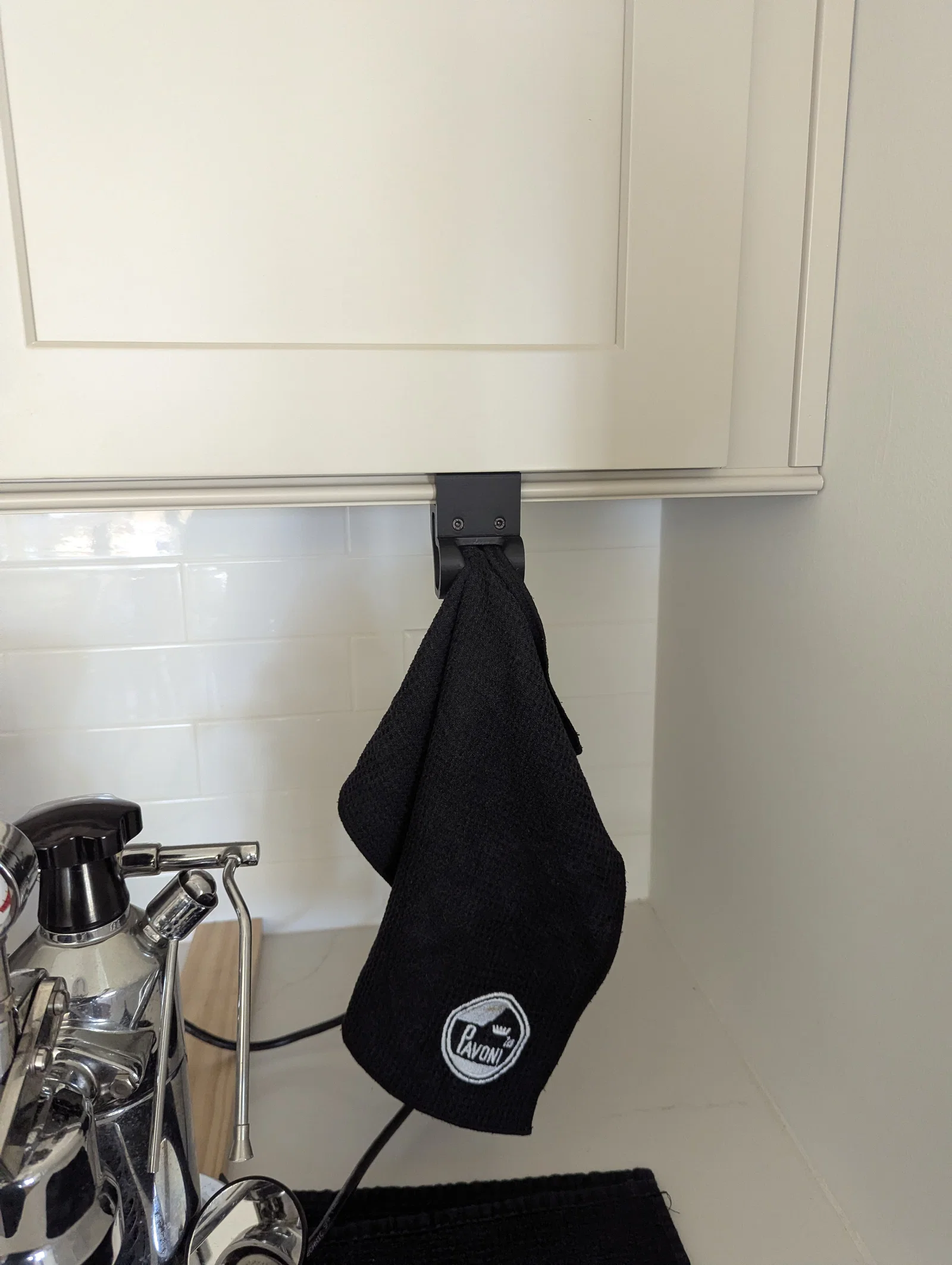 Móc treo khăn nhà bếp tiện lợi, được thiết kế để gắn trực tiếp vào cạnh cửa tủ hoặc gờ tủ. Sản phẩm yêu cầu lắp ráp với ốc M4 và đai ốc lục giác đi kèm để cố định chắc chắn.