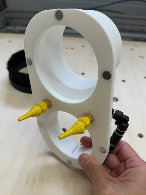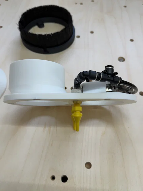 1 cái @ 4" kẹp ống hút bụi 24 viên @ nam châm 3/8x1/8 N42/N52 - 12 viên giữa chụp chính và hộp gom bụi, 12 viên giữa hộp gom bụi và vòng đệm chổi 2 cái @ 1/4 npt female sang 1/4 ptc elbow 2 cái @ 1/4 npt male sang 1/8 npt female 2 cái @ 1/8 npt ren 1/4 loc-line 41405 2 cái @ 1/4 loc-line béc phun 1/16 41402 1 cái @ 1/4 ptc sang 1/4 ptc elbow 1 cái @ 1/4 ptc đầu chia chữ T ~18" (khoảng 45cm) chổi 1/8" từ McMaster Carr (loại 2" hoặc 3" tùy vào độ dài của dụng cụ cắt) - mã 7900T807 hoặc 7900T907