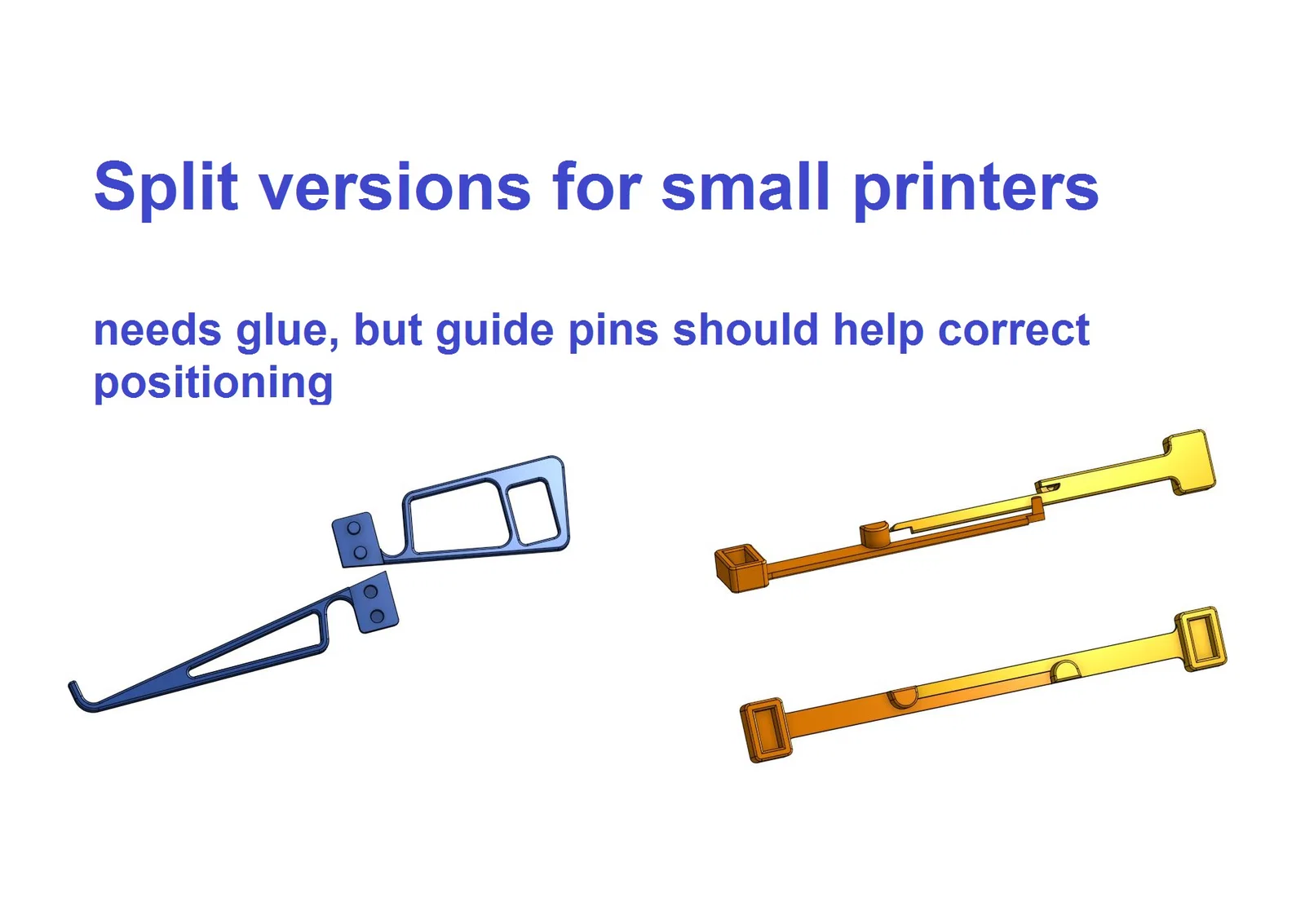 Cập nhật 2023-04-03 .. 2023-04-06: Các phiên bản Split cho máy in nhỏ: Dành cho những ai có laptop lớn nhưng máy in khổ nhỏ, tôi đã tạo ra các phiên bản cắt nhỏ của mảnh bên và mảnh giữa (cả V1 và V2). Điều này cho phép in trên bàn in nhỏ nhưng vẫn có thể phóng to cho laptop lớn hơn (17" hoặc hơn). Nhờ có các chốt dẫn hướng, độ ổn định không hề bị ảnh hưởng (đã kiểm chứng). Bạn nên dùng thêm keo, mặc dù các phần ghép có thể tự khớp "press-fit". Hai bên trái và phải giống hệt nhau, nghĩa là bạn cần in mỗi loại 2 bản (2x SideSplit-1, 2x SideSplit-2 và 2x MidSplit).