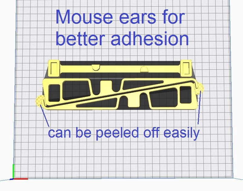 Mẹo in ấn: Dễ in, không cần support. Nếu bàn in của bạn bám dính không hoàn hảo, hãy cố định phần mỏng của các mảnh bên bằng "anti-warping pad" trong Cura (plugin TabAntiWarping). Trong PrusaSlicer, bạn có thể thêm một vài "tai chuột" (mouse ears) cho cùng mục đích này.