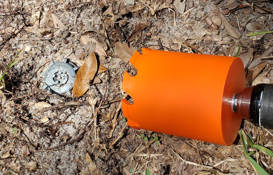 Các đầu tưới phun nước trong vườn nhà tôi bị cỏ che lấp hết rồi, nên tôi đã tự thiết kế một chiếc cưa lỗ 3 inch để giúp làm sạch khu vực xung quanh. Bạn chỉ cần gắn một con bu lông 1/4-20 vào tâm và dùng đai ốc cố định lại. Dụng cụ này hoạt động rất hiệu quả trong việc phá vỡ lớp đất cứng và cỏ bao quanh đầu vòi tưới.