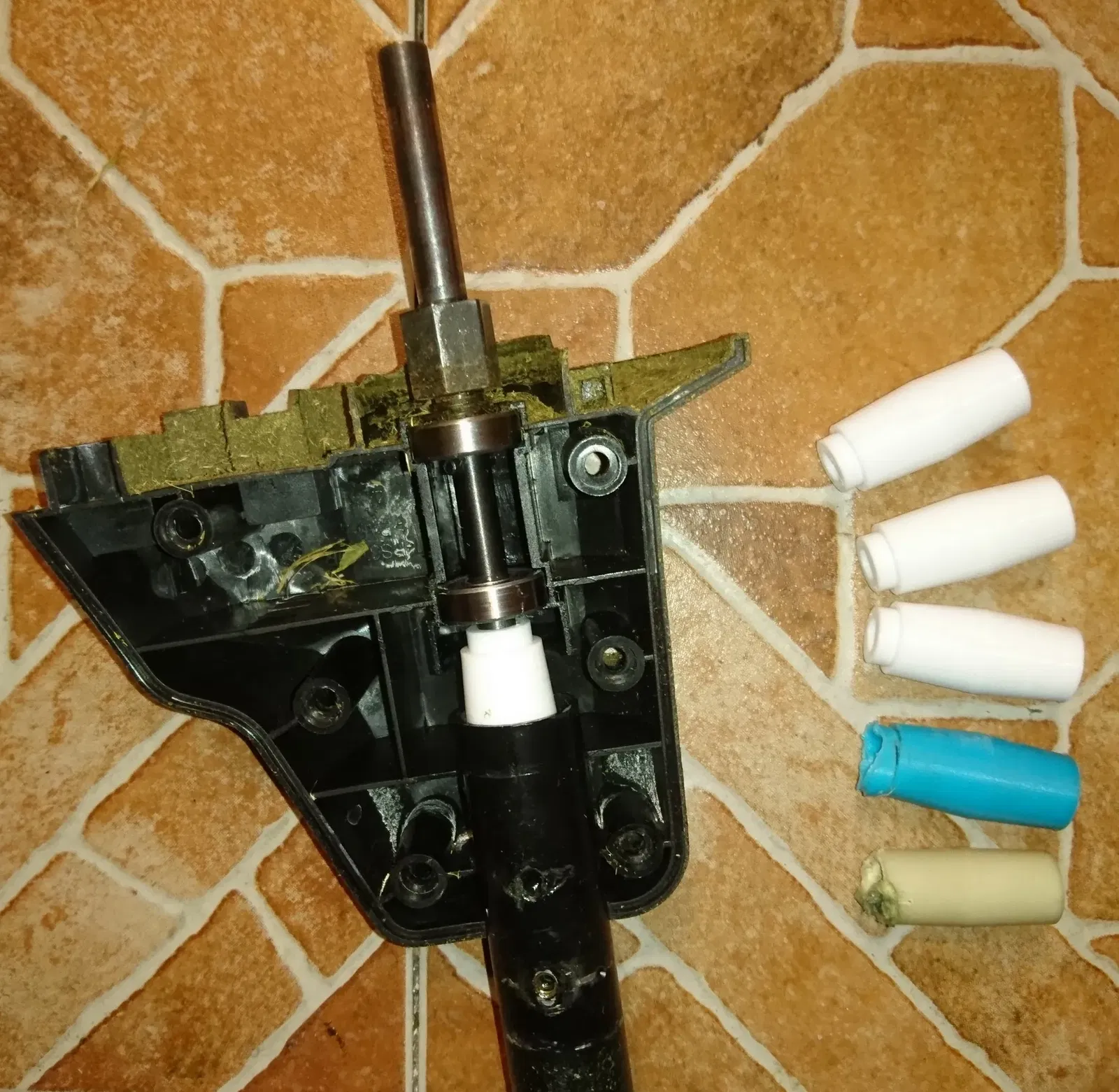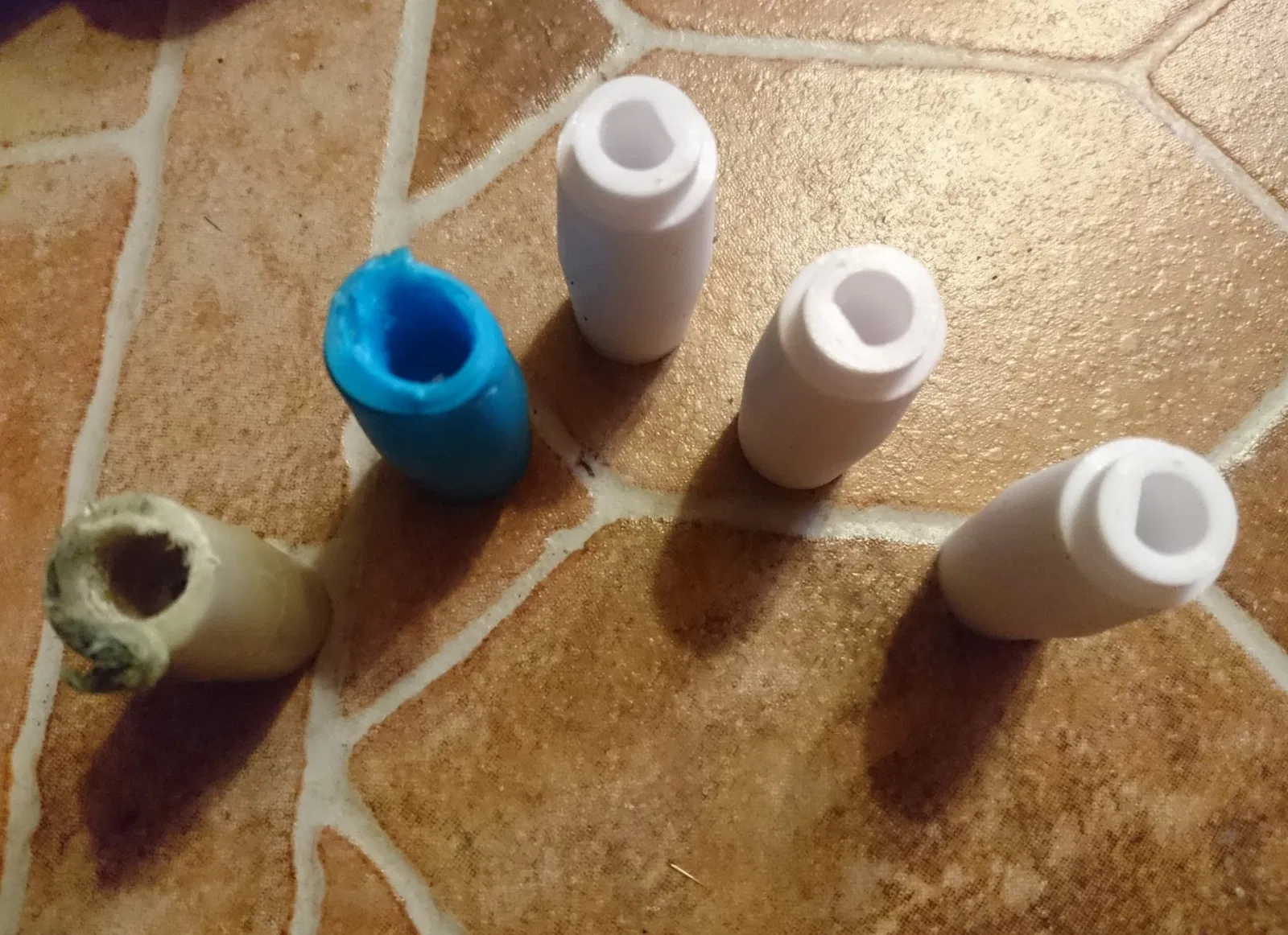 Khớp nối gốc đã bị gãy (màu ngà trong ảnh). Tôi đã làm nó từ PLA+ (màu xanh nhạt trong ảnh) - nó chỉ kéo dài được 20 phút làm việc, đã tan chảy và vỡ vụn. Được làm từ PETG (màu trắng trong ảnh). Sau một giờ làm việc, tôi đã tháo rời máy cắt - khớp nối trục khuỷu không bị hư hại.