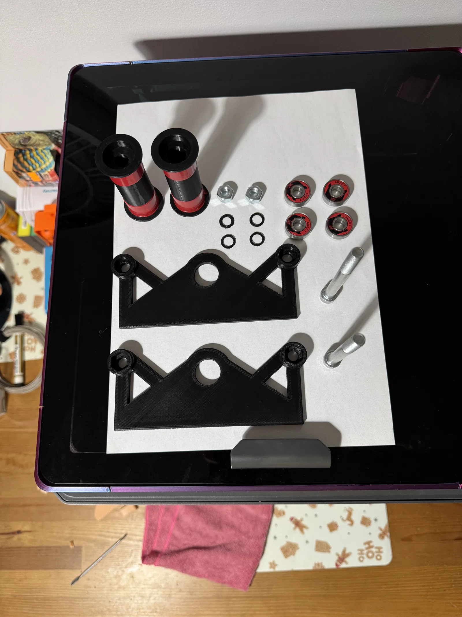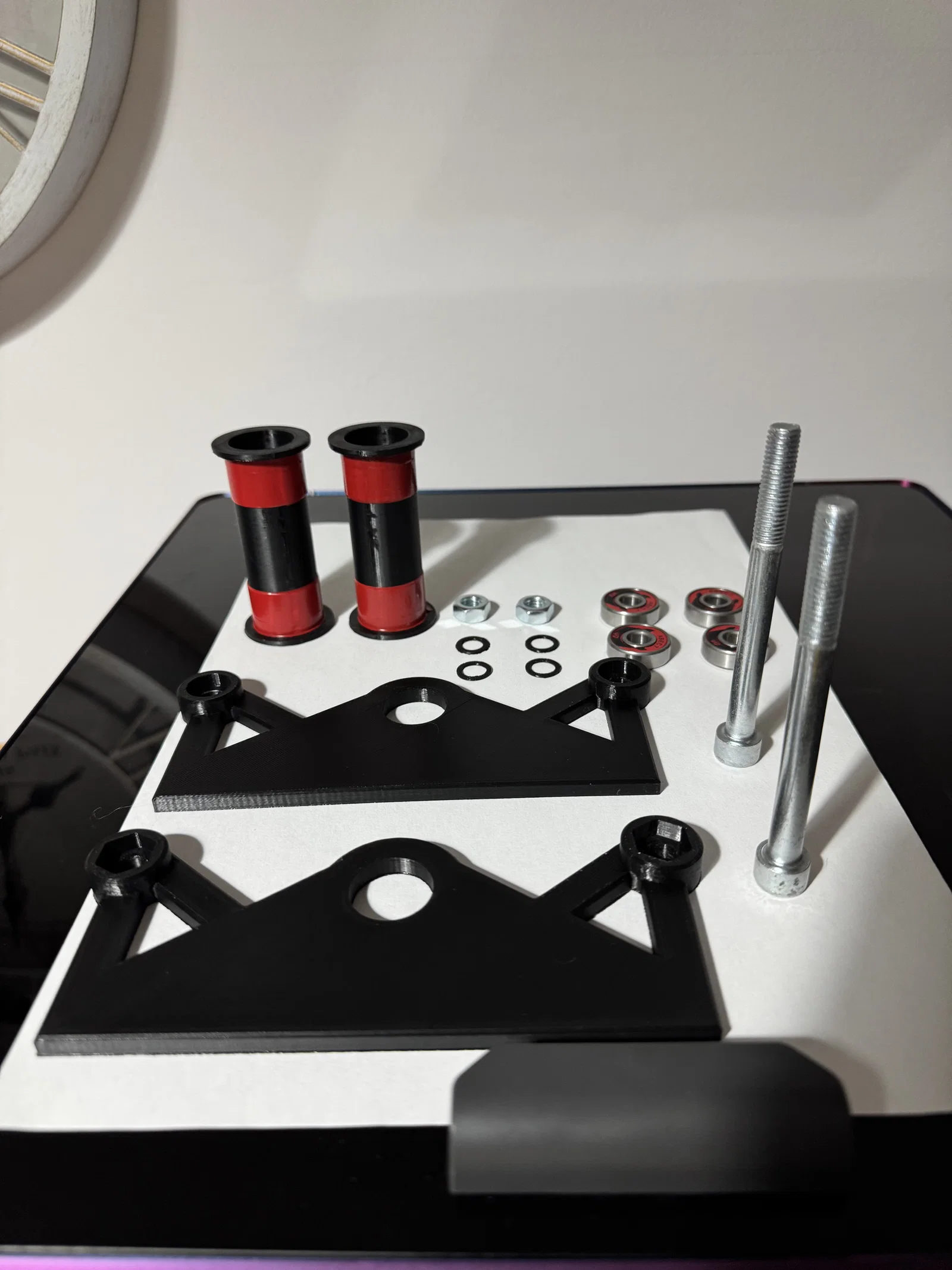 Phụ kiện cần thiết: 4 x vòng bi 608 (vòng bi ván trượt tiêu chuẩn) 2 x ốc lục giác M8 (tối thiểu 105mm) 2 x đai ốc M8 4 x long đền M8 (bạn có thể dùng long đền kim loại tiêu chuẩn hoặc in file 'pads x 4 psc.stl' đi kèm)