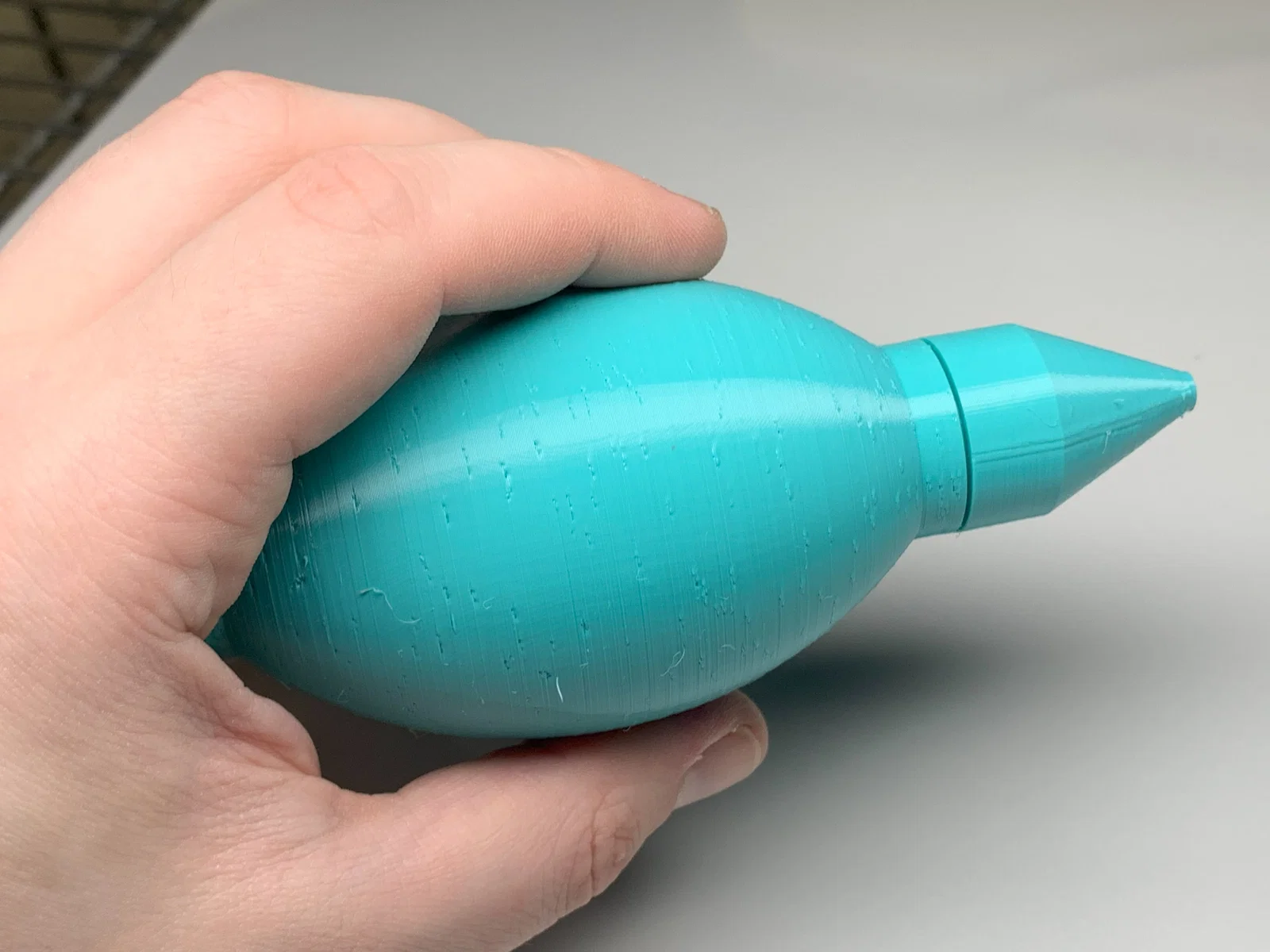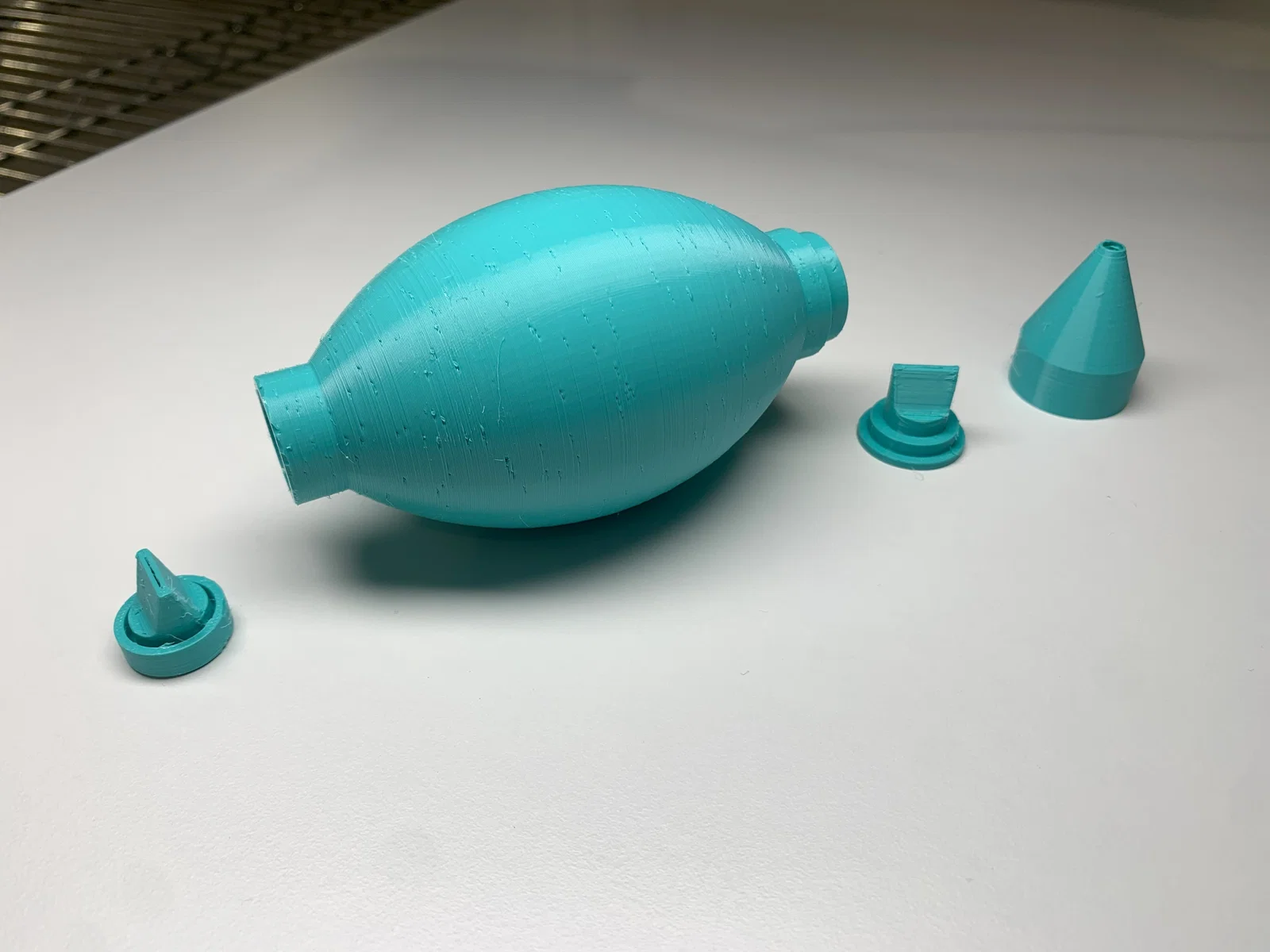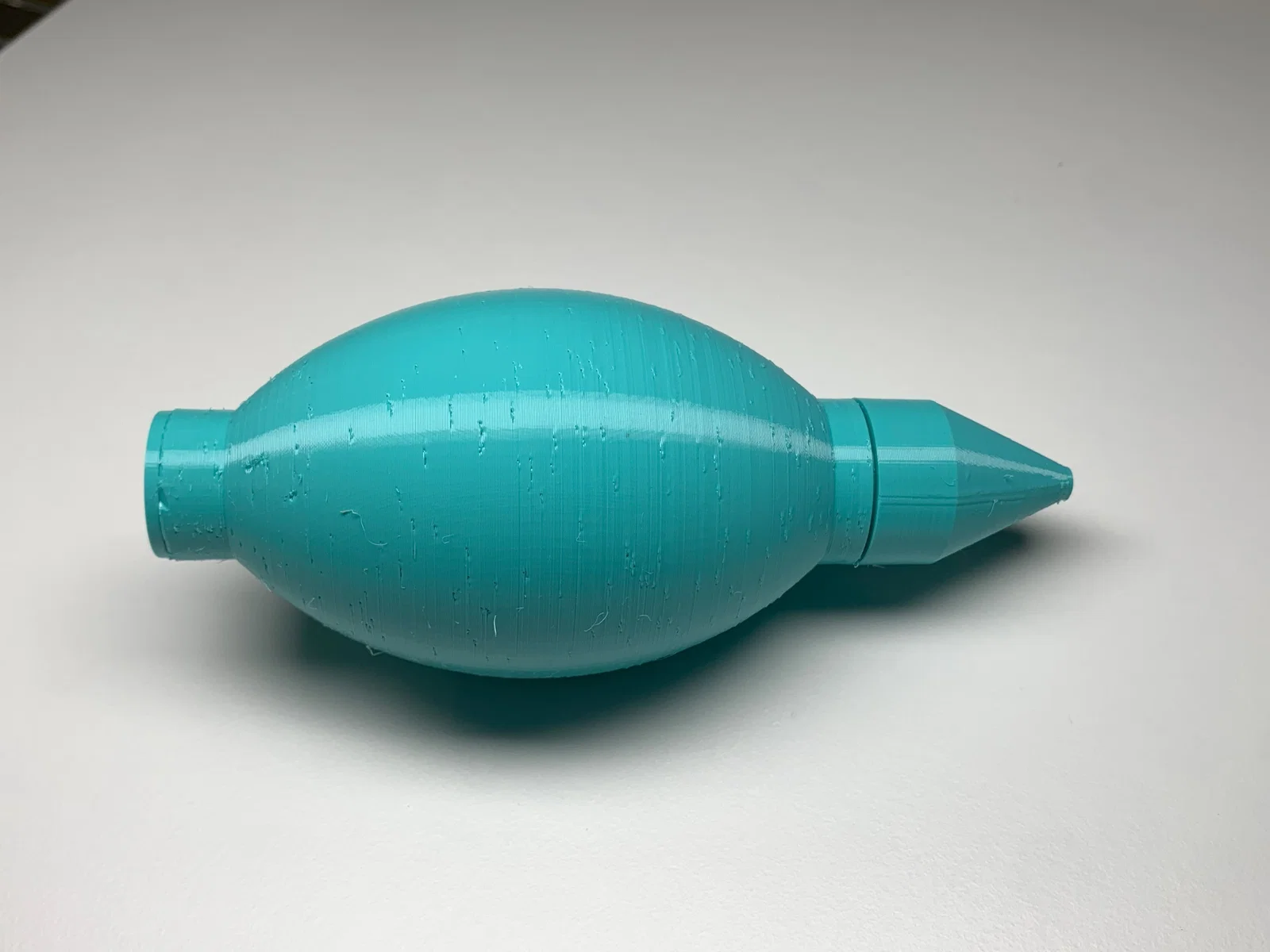 Về cái máy thổi bụi bàn phím, mình muốn thiết kế một chiếc bơm hơi toàn bộ bằng TPU không cần bộ phận chuyển động, và máy thổi bụi là cái dễ làm nhất. Thiết bị gồm 4 thành phần TPU: van nạp, van xả, quả cầu bóp và một đầu vòi để thu luồng khí thành tia mạnh. Quả cầu được in với infill gyroid thưa, tạo độ đàn hồi giúp nó tự phồng lại sau mỗi lần bóp. Mình có để file quả cầu rỗng hoàn toàn cho ai muốn thử, nhưng loại đó không tự nạp hơi tốt nên mình không khuyến khích đâu.