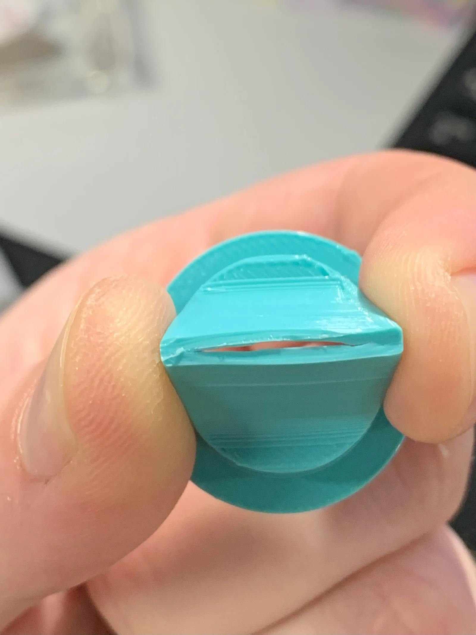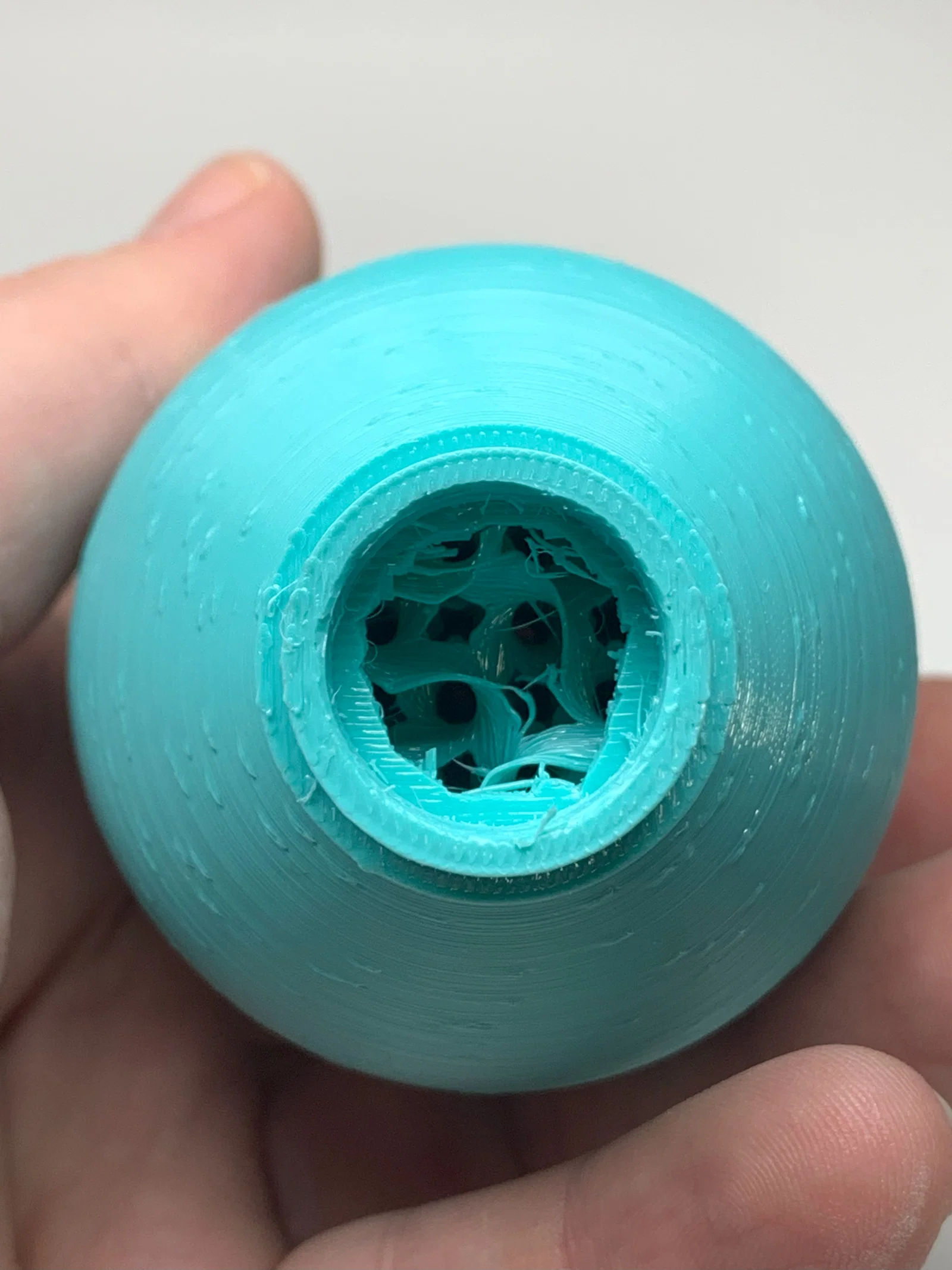 2. Quả cầu sẽ bị bít kín ở đầu nạp và xả sau khi in; bạn phải mở thông chúng ra bằng cách dùng dao rọc giấy hoặc mỏ hàn để khoét bỏ phần nhựa thừa. Dùng dao cắt sẽ gọn gàng hơn.