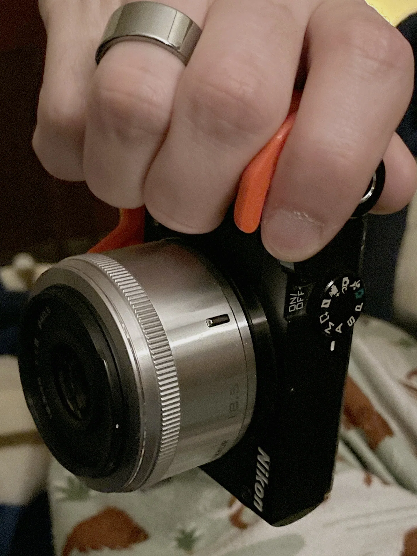 Thiết kế này sử dụng cơ chế ép chặt vào vị trí gắn dây đeo zin ở phía trên bên phải để giảm độ flex (rung lắc). Sau khi vát mép cạnh trên để bạn dễ với ngón tay tới nút chụp hơn, mình không tìm được vị trí nào ưng ý để đặt thêm móc dây đeo nữa. Bản thân mình giờ cũng không dùng điểm đó, chỉ dùng móc dưới bên phải để gắn dây đeo cổ tay thôi. Nếu bạn cần, bạn có thể tự chỉnh sửa lại thiết kế để thêm vào nhé.