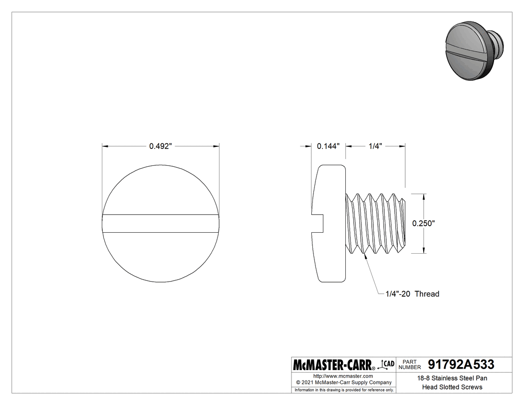 Mình đã sử dụng loại ốc này: https://www.mcmaster.com/91792A533/. Đây là chuẩn ốc 1/4" 20 với thân dài 1/4", đường kính đầu 0.492" và độ sâu đầu 0.144".