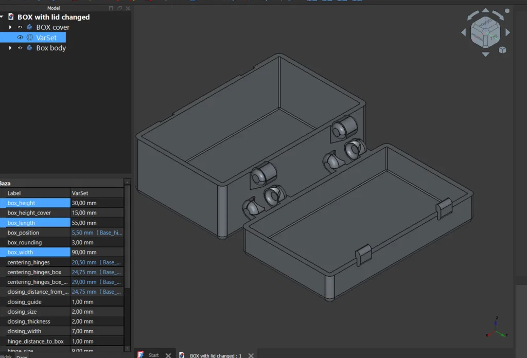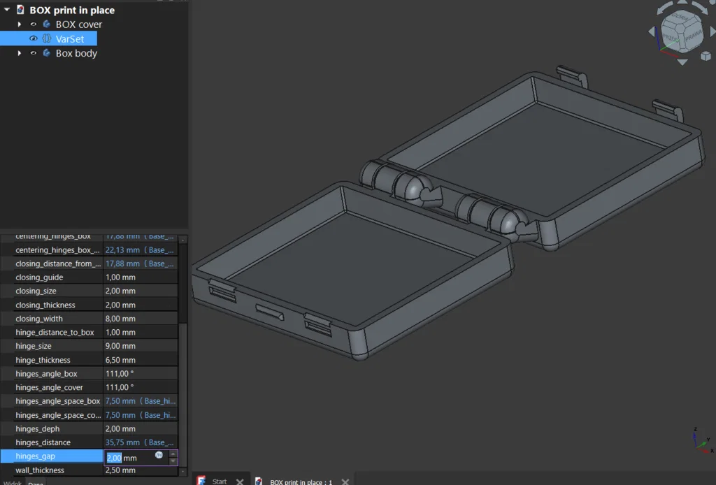 Đây là mẫu hộp đa năng, in liền khối (print-in-place) mà không cần hỗ trợ (support). Bản lề hoạt động trơn tru và nắp đậy đóng mở nghe tiếng "tách" rất đã. Các mẫu được cung cấp ở đây rất lý tưởng để đựng pin và bạn có thể dễ dàng tùy chỉnh bằng cách thay đổi các biến số trong phần "VarSet" của dự án FreeCAD. Bạn có thể thay đổi các thông số như: kích thước hộp (x, y, z), độ dày thành hộp, khe hở bản lề, khoảng cách giữa các bản lề và kích thước bản lề. Tất cả những thông số này đều dễ dàng điều chỉnh trong dự án FreeCAD - bạn hãy xem các ảnh chụp màn hình mà mình đã đính kèm nhé.