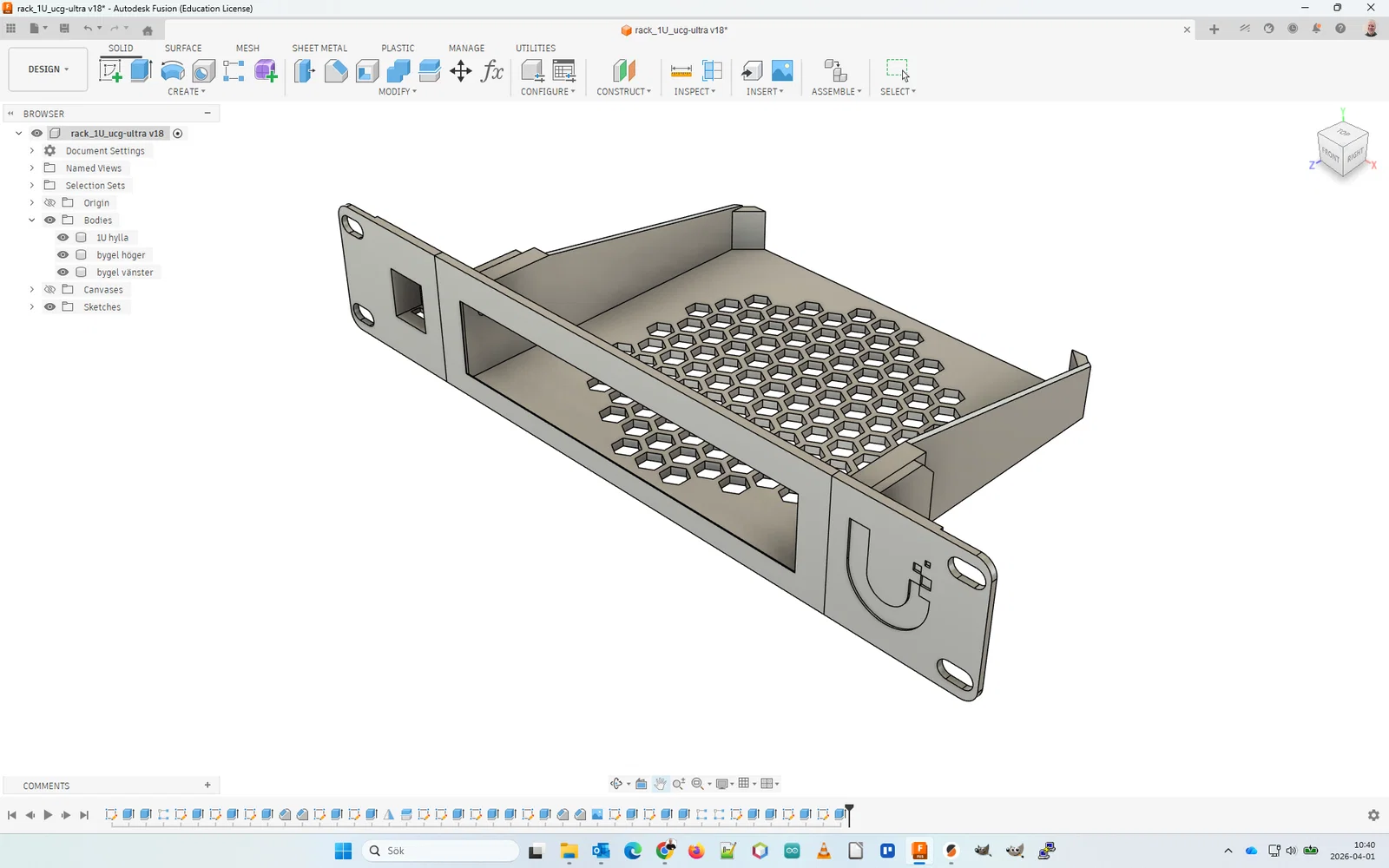 Khay rack 10" dành cho các dòng gateway Ubiquiti Cloud Gateway Ultra/Max. Mô hình được chia làm 3 phần (khay, ngàm trái & phải) để có thể in được trên các bàn in có kích thước nhỏ. Ngàm bên trái còn có sẵn một khe để gắn Keystone jack. Các ngàm được cố định vào khay bằng ốc M3 bắt vào insert ren nhiệt (heat-set threaded inserts). Nếu bạn có máy in với bàn in lớn hơn, bạn hoàn toàn có thể in các bộ phận này thành một khối duy nhất.