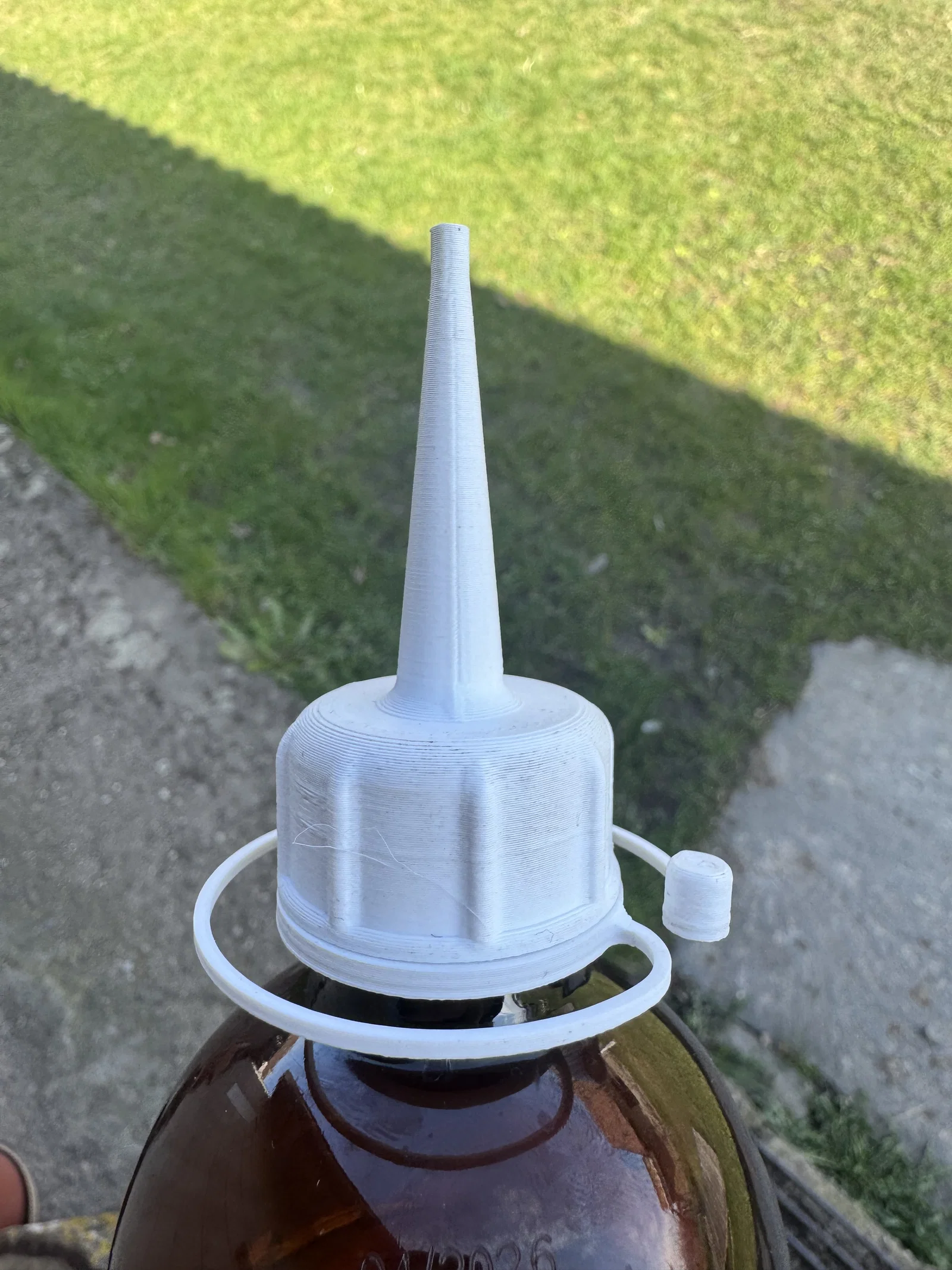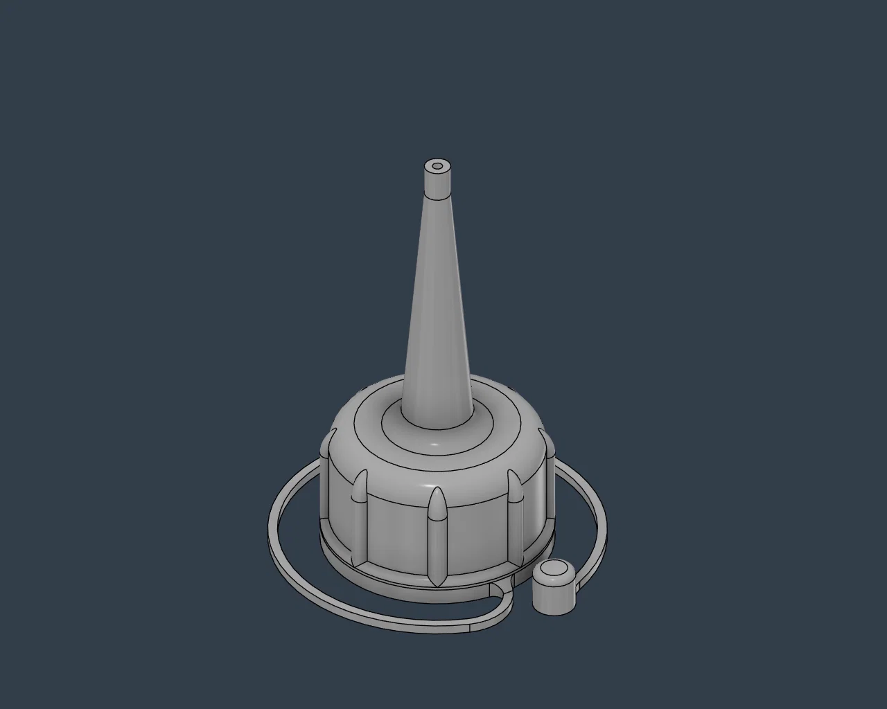 Đây là đầu vòi cho chai PET có kèm nắp. Dùng cho các mục đích như đựng dầu hoặc dung dịch nhũ tương khoan. Bạn cần in vòi này bằng vật liệu không bị ăn mòn khi tiếp xúc với hóa chất bên trong chai. Tôi có thiết kế thêm một rãnh để lắp vòng đệm (O-ring), giúp tránh rò rỉ tại ren vặn khi bóp chai. Kích thước vòng đệm tôi dùng gần tương đương với loại này: https://www.arkov.cz/p/ok-20-5x2-5-nbr70-o-krouzek-pryzovy-30-c-100-c-160bar-tvrdost-70sha--i0000154992. Cá nhân tôi đã sử dụng nhựa PETG để in.