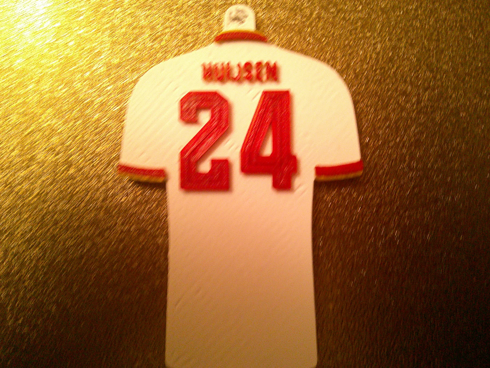 Mẫu thiết kế này được tạo hình tỉ mỉ dựa trên mẫu áo đấu thực tế với đầy đủ tên cầu thủ và số áo phía sau lưng. Bạn có thể dễ dàng in ấn tại nhà bằng máy in 3D của mình để tạo ra những món quà lưu niệm ý nghĩa cho bạn bè hoặc chính bản thân. Sự kết hợp màu sắc giữa nền trắng chủ đạo cùng các chi tiết vàng và đỏ nổi bật tạo nên vẻ ngoài rất bắt mắt, chuẩn tinh thần của đội tuyển xứ bò tót.