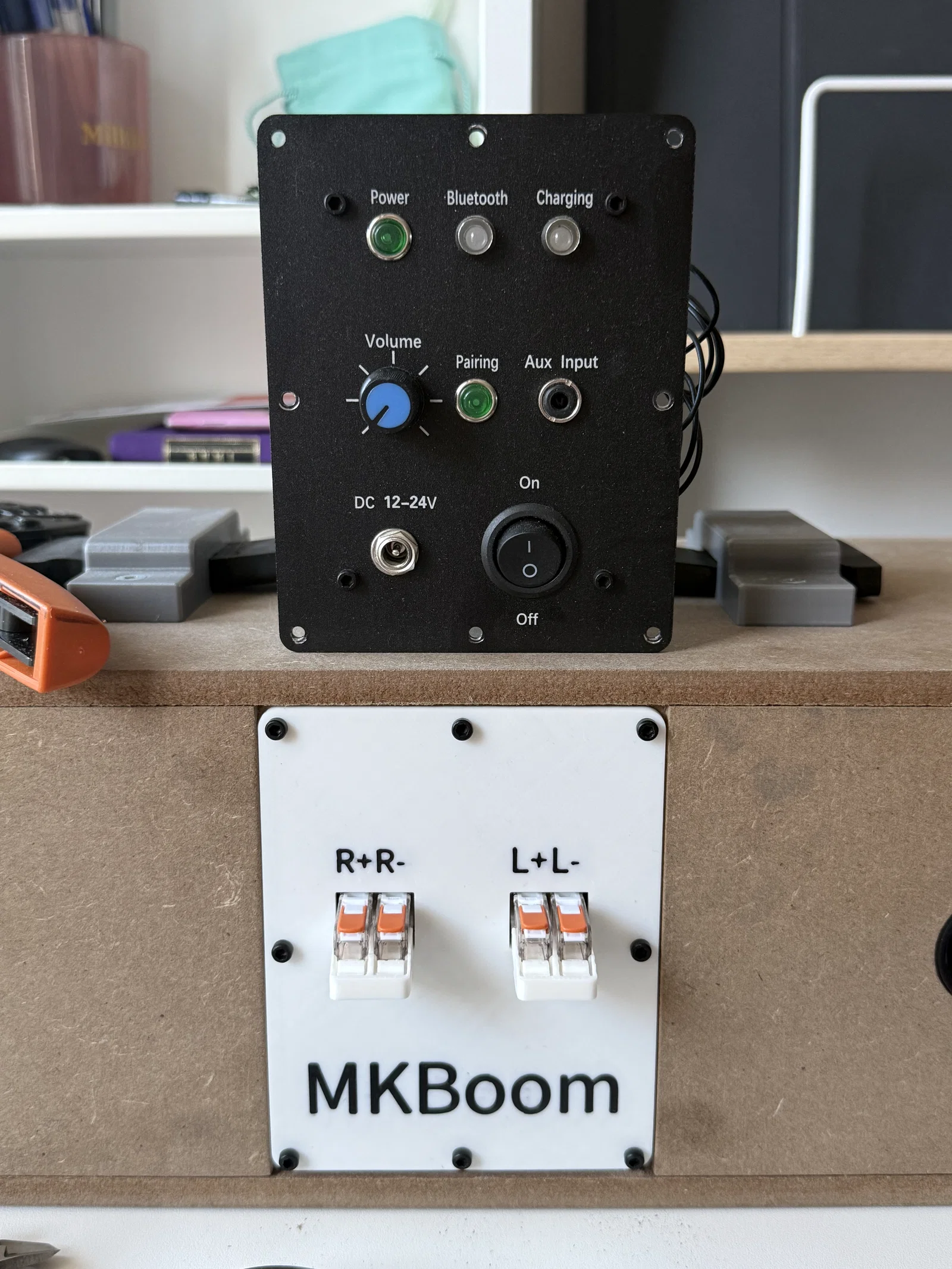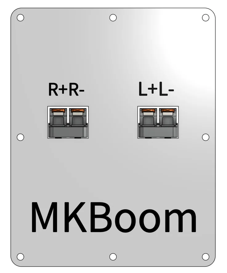 Panel in nhiều màu cho bộ loa Dayton Audio MKBoom, được thiết kế để kết nối với ampli rời thông qua cút nối Wago 221-2401 và ốc M3x10. Giải pháp gọn gàng, tiện lợi thay thế cho bảng điều khiển mặc định.