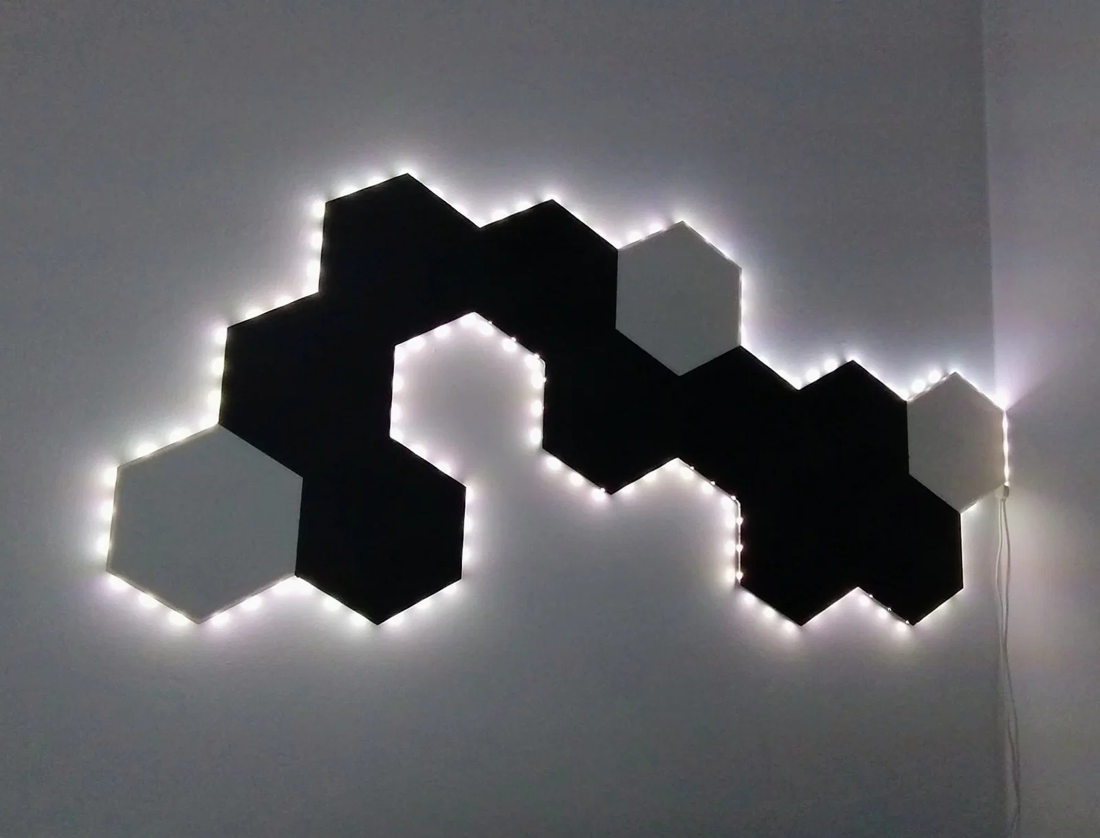 Để gắn dây đèn LED, bạn cần nối các tấm lại thành một khối. Sau đó chỉ cần bóc lớp keo trên dây LED và dán vào rãnh phía sau tấm ốp. Đi vòng quanh cấu trúc cho đến khi hết vòng dây. Bạn có thể dùng thêm keo siêu dính để cố định thêm ở vài chỗ, nhưng thường thì keo 3M đi kèm đèn là đủ dùng rồi.