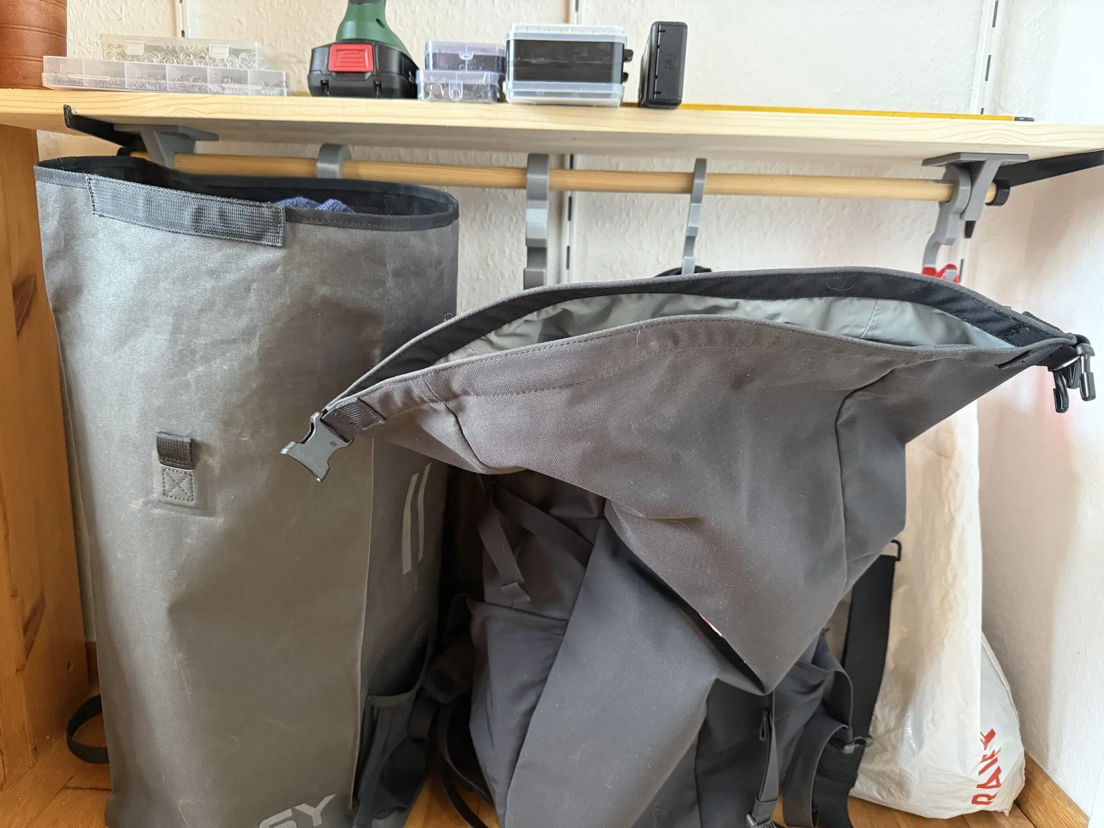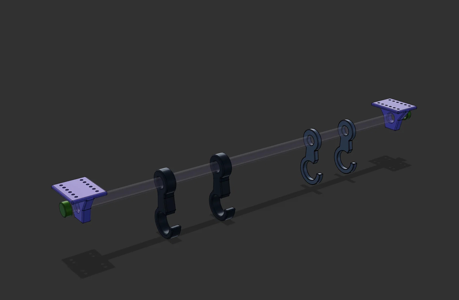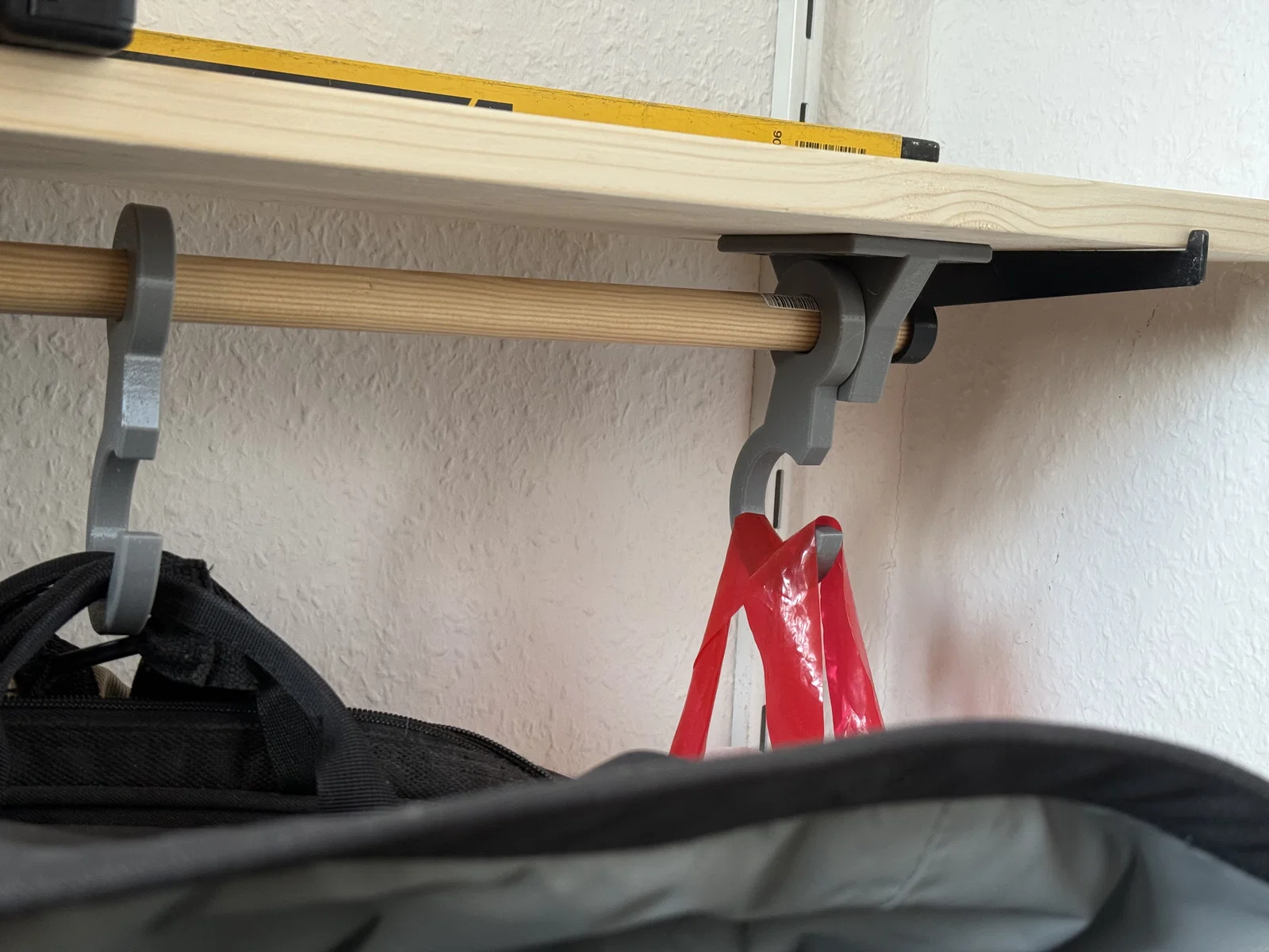 Vì mấy cái túi với ba lô của mình hay bị ngã đổ đồ đạc lung tung, nên mình đã thiết kế mấy cái móc này để trượt lên một thanh gỗ. Thanh gỗ này sẽ được cố định bên dưới kệ, và mấy cái móc có hai kích thước khác nhau để mọi người linh hoạt sử dụng. Ngoài ra, mình cũng có thêm phần giá đỡ để treo thanh gỗ đó lên kệ nữa.