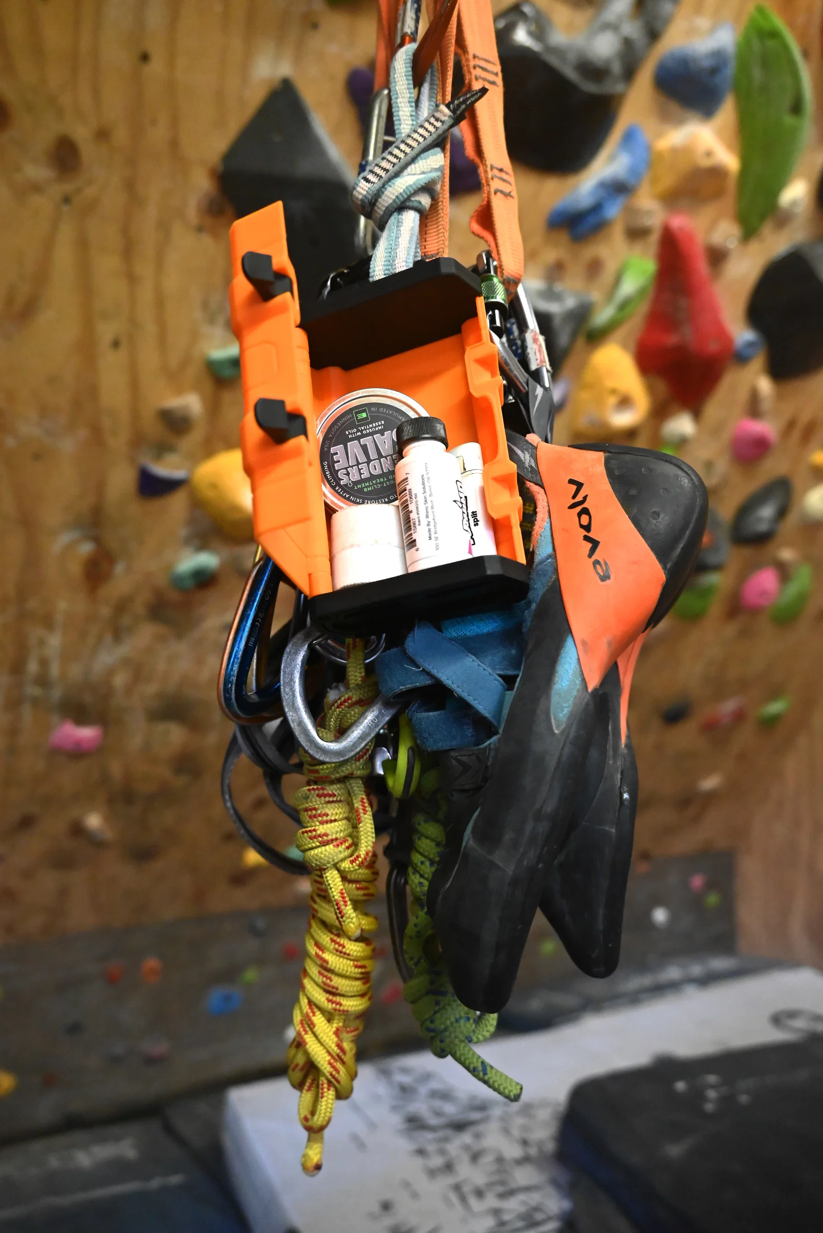 Là một người leo núi, mình thấy việc tìm chỗ chứa đồ khi đang treo mình trên dây là một vấn đề khá nan giải, vì vậy mình đã thiết kế một vài giải pháp cho vấn đề này. Đây là một trong số đó. Được thiết kế để đựng dụng cụ hoặc các linh kiện nhỏ khi làm tuyến (routesetting) trong phòng gym hoặc leo núi ngoài trời, chiếc hộp này có thể treo rất chắc chắn trên đai đeo (harness) hoặc ba lô của bạn.