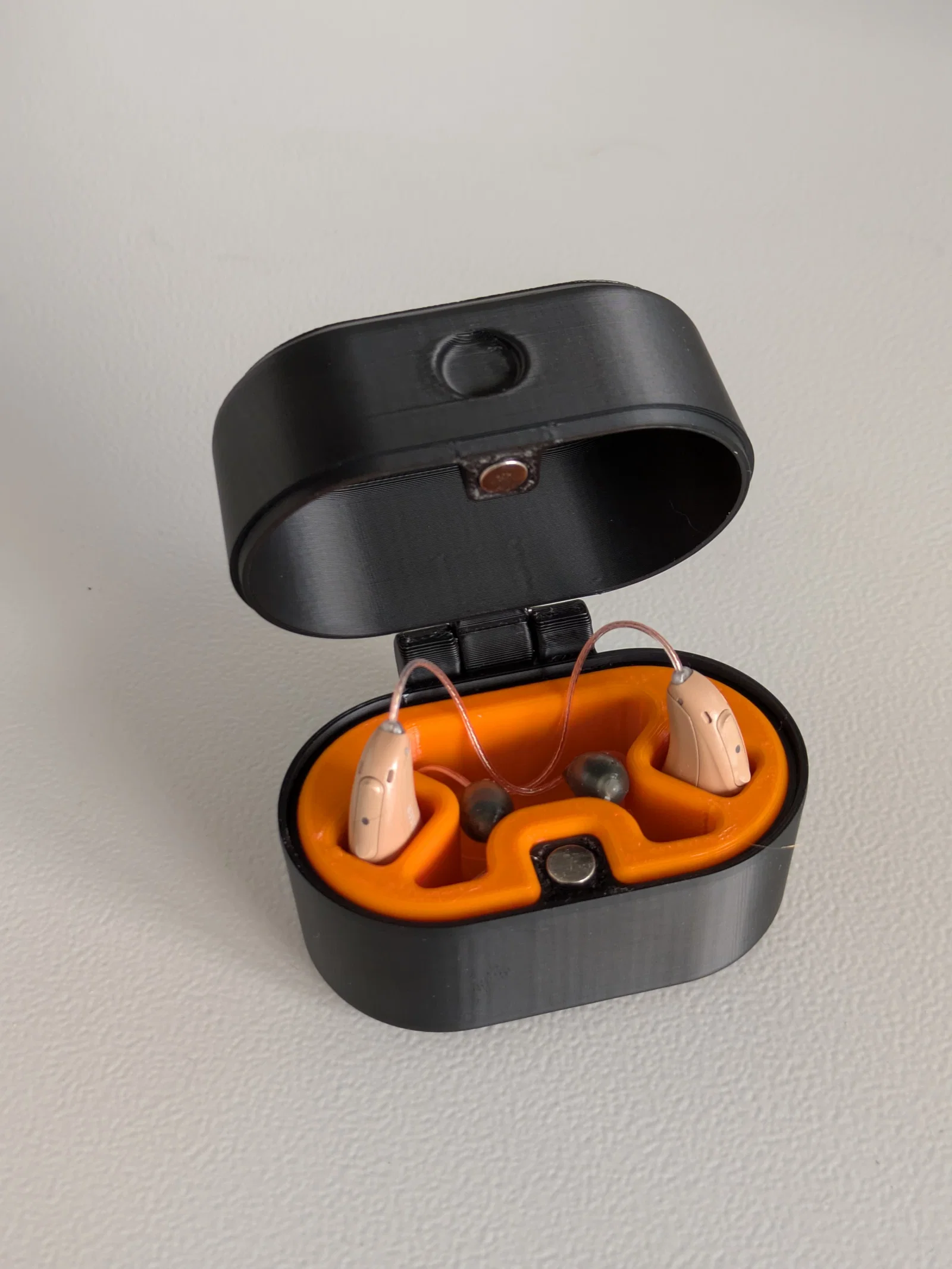 Phần khay lót bên trong được thiết kế riêng cho máy trợ thính Sennheiser Sonite R, cũng có hai vị trí để gắn nam châm 6x3mm. Những viên nam châm này sẽ giữ máy cố định, tránh bị rơi ra ngoài ngay cả khi bạn dốc ngược hộp. Khay này có thể dùng được cho các hãng khác. Nếu không vừa, bạn có thể sử dụng file .step đi kèm để chỉnh sửa cho phù hợp với máy trợ thính của mình.