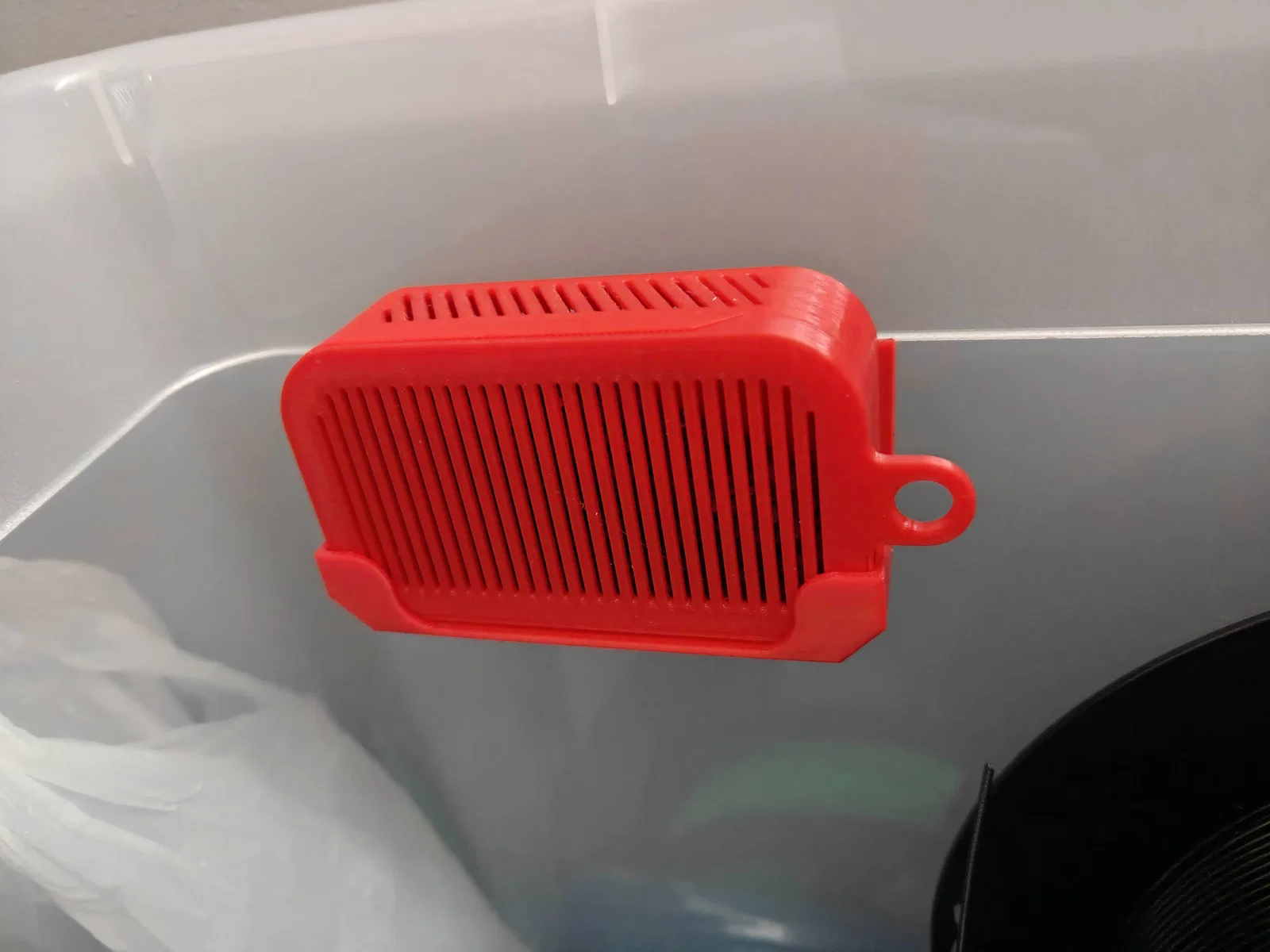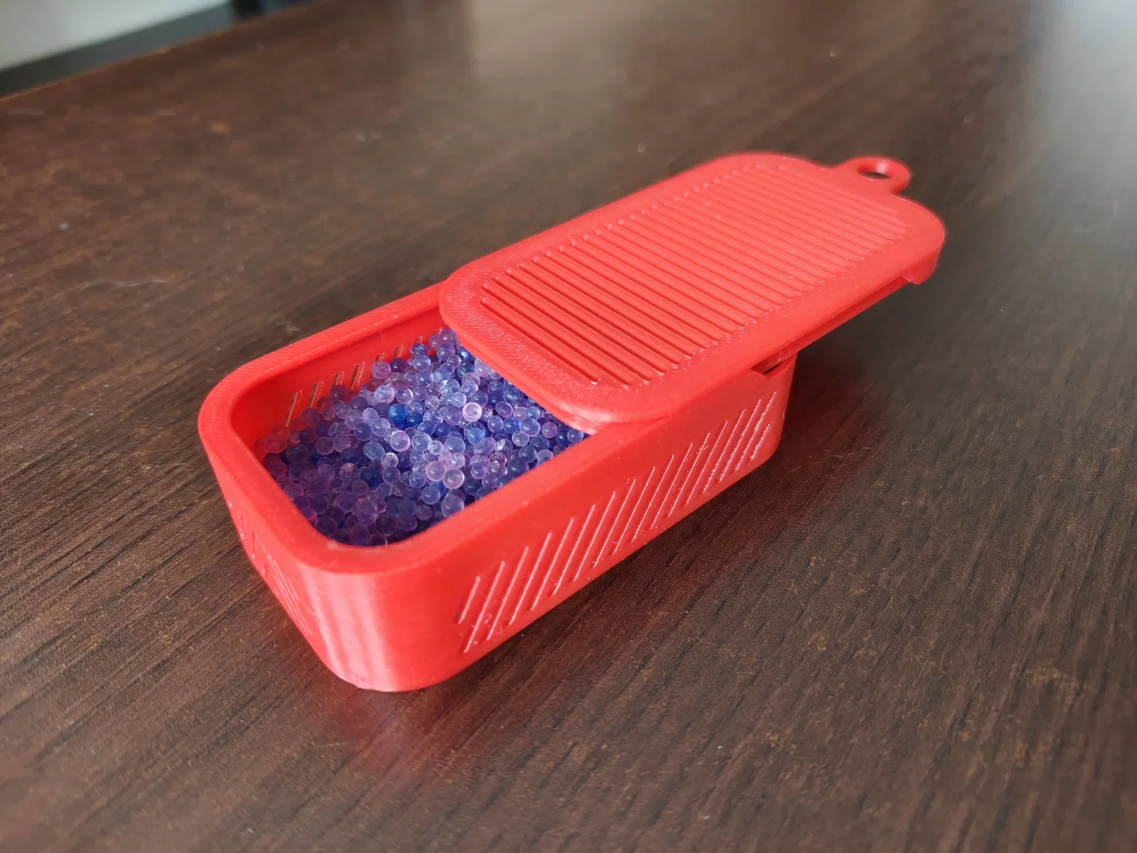 Các khe hở rộng 1mm, nên hạt silica gel sẽ không bị lọt ra ngoài. Nắp được thiết kế kiểu trượt và có gờ để dễ dàng đóng mở. Trong các file đính kèm có sẵn ngàm để bạn dán bằng băng keo hai mặt lên tường hộp đựng dây in (filament) hoặc các vị trí tương tự.