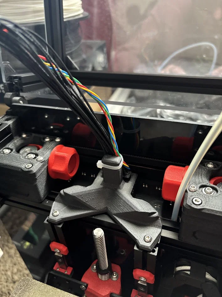 Nếu bạn đang sở hữu chiếc máy in 3D Voron V0.2 và cảm thấy lo lắng về độ bền của hệ thống dây điện (umbilical cable), thì đây chính là món phụ kiện mà bạn đang tìm kiếm. Bộ phận này đóng vai trò là một giá đỡ chịu lực, giúp giảm thiểu sự co kéo trực tiếp lên các cổng kết nối và dây dẫn khi đầu in di chuyển liên tục trong quá trình in ấn. Với thiết kế chắc chắn, nó giúp cố định bó dây cáp một cách gọn gàng và an toàn, ngăn ngừa các sự cố đứt gãy hoặc lỏng kết nối không đáng có.