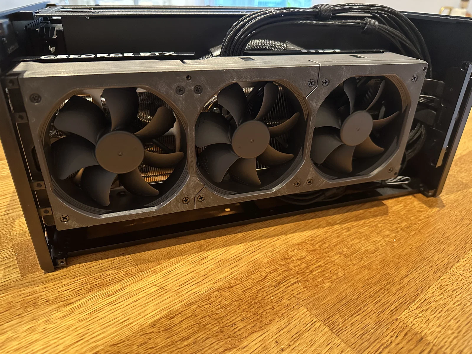 3 chiếc quạt được lắp bằng cách tận dụng hình dáng gốc của quạt để 'khớp' vào vị trí như hình bên dưới. Nghĩa là chỉ những loại quạt có thiết kế tương tự Noctua NF-A9 25 mm mới dùng được.