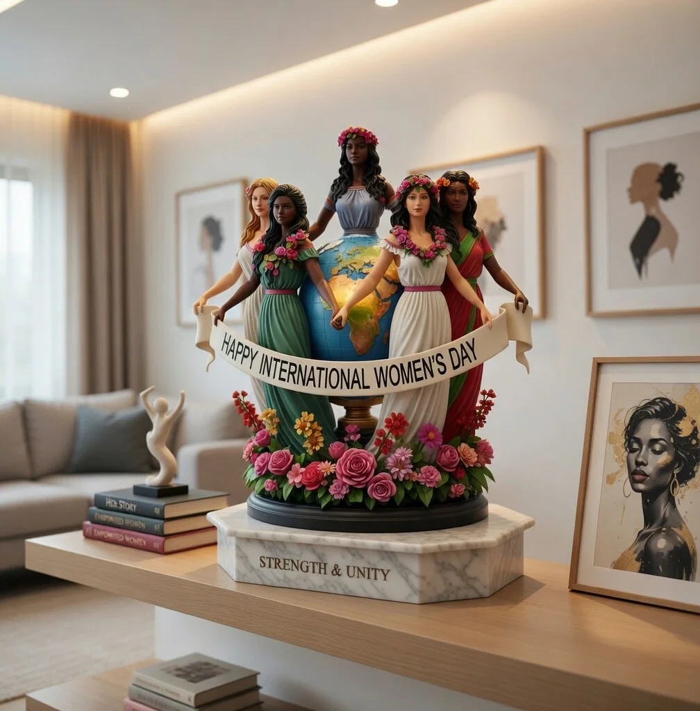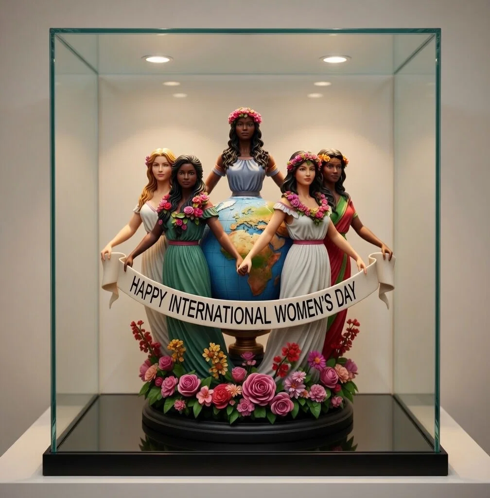Mô hình này khắc họa hình ảnh năm người phụ nữ đến từ những vùng miền khác nhau trên thế giới, đang nắm tay nhau đầy gắn kết. Họ đứng quanh một quả địa cầu, tượng trưng cho tình đoàn kết toàn cầu và sức mạnh của phụ nữ. Được bao quanh bởi những đóa hoa rực rỡ, thiết kế này truyền tải thông điệp về hòa bình, bình đẳng và vai trò to lớn của người phụ nữ trong xã hội hiện đại.