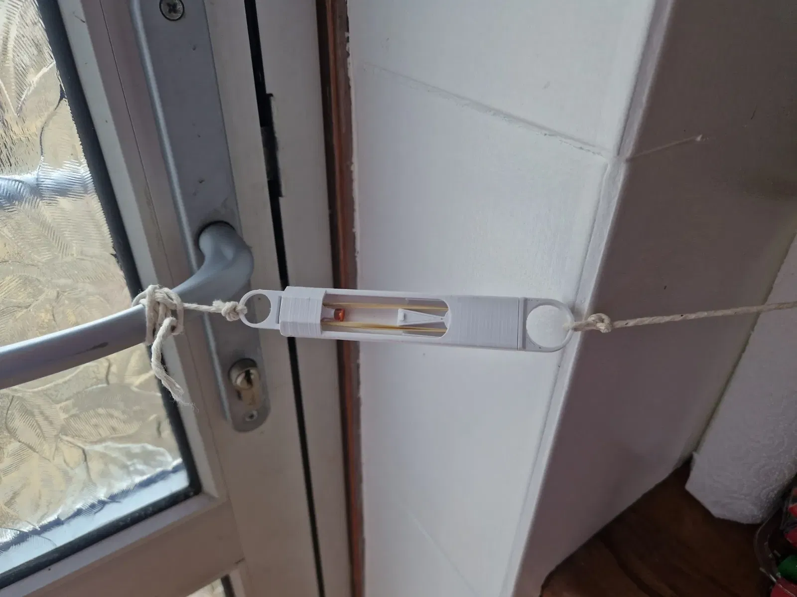 sử dụng lỗ vuông ở đáy buộc nó vào một cái gì đó vững chắc, sau đó buộc vòng vào một sợi dây đi qua cửa, v.v. khi vòng bị kéo ra, nó sẽ giải phóng búa và kích hoạt nắp.