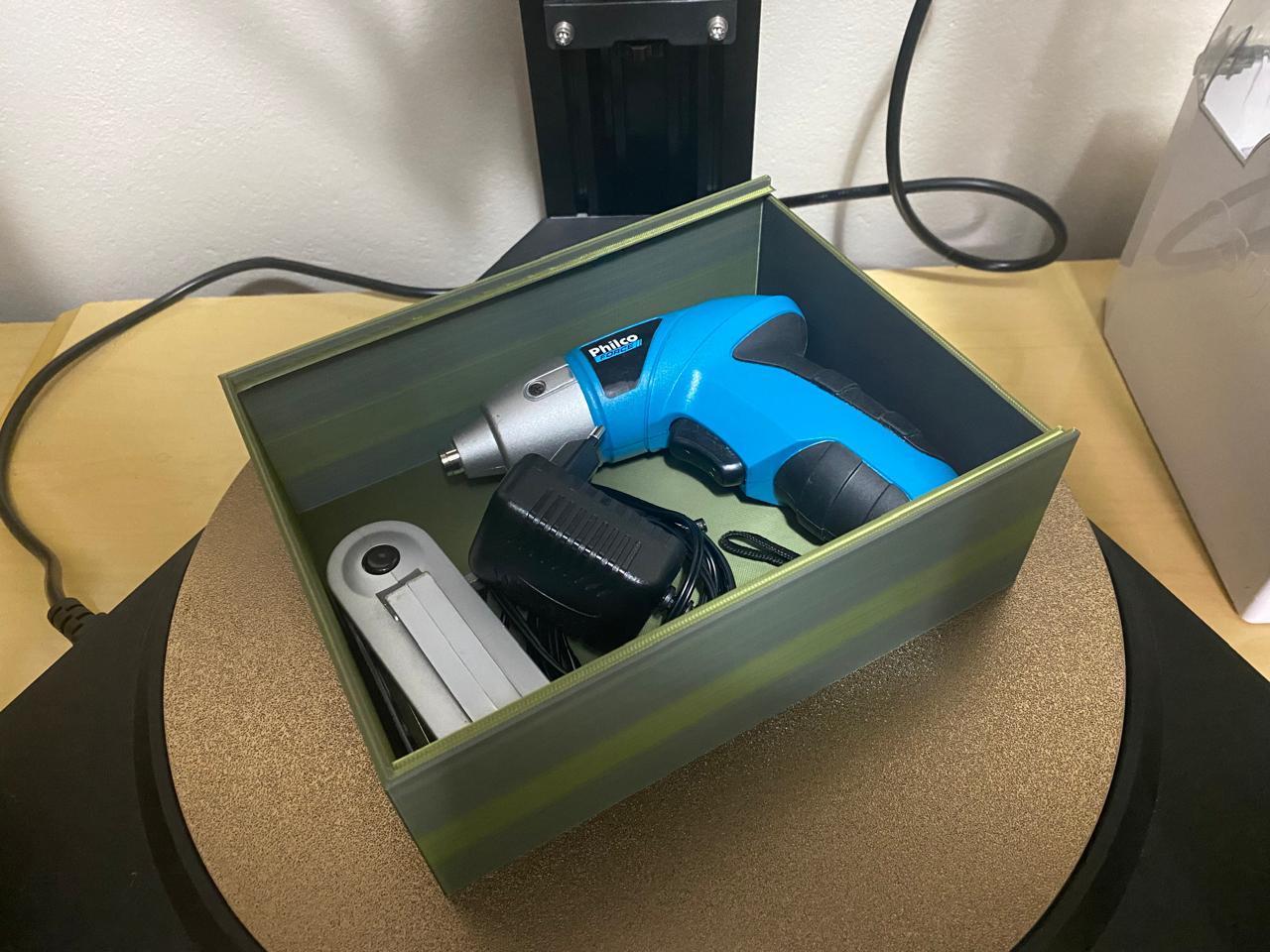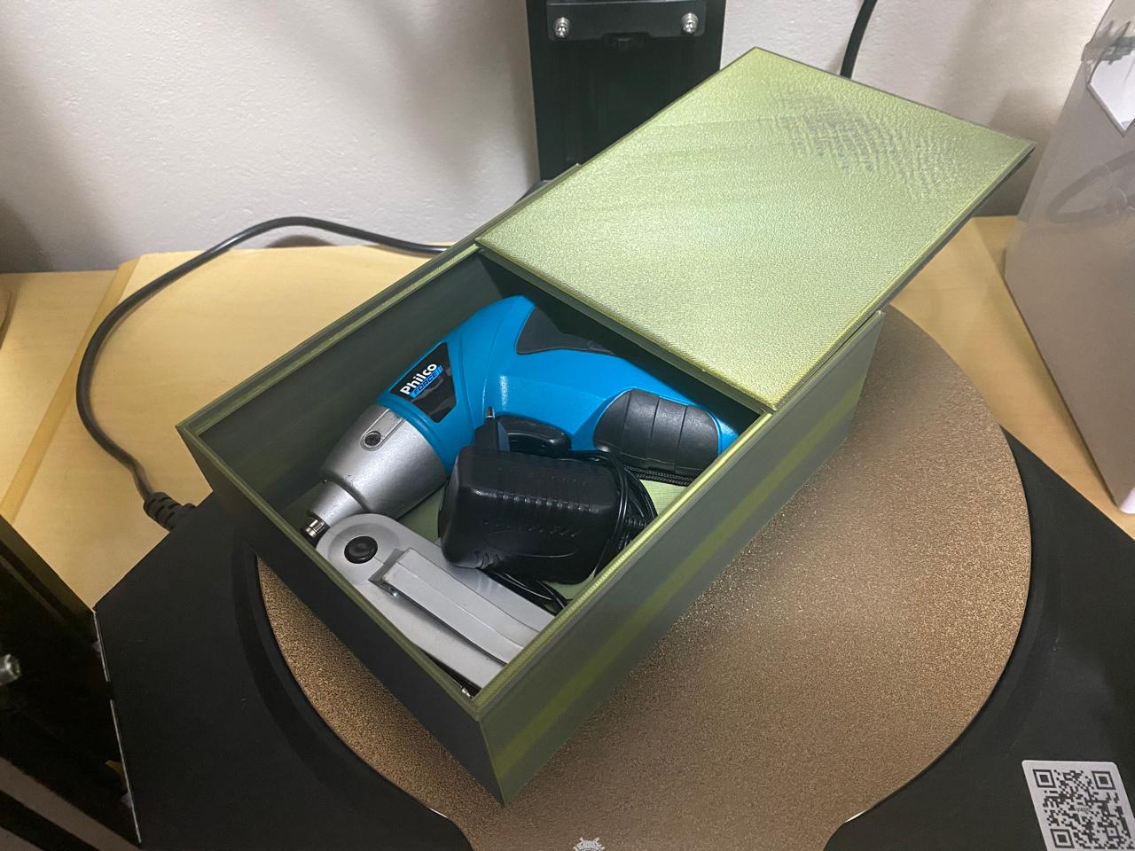 Hộp đựng dụng cụ thiết kế đơn giản với nắp trượt tiện lợi. Được tối ưu để cất giữ máy bắt vít và phụ kiện, khuyến khích in bằng nhựa PETG hoặc ABS để đảm bảo độ bền chắc chắn cho sản phẩm.