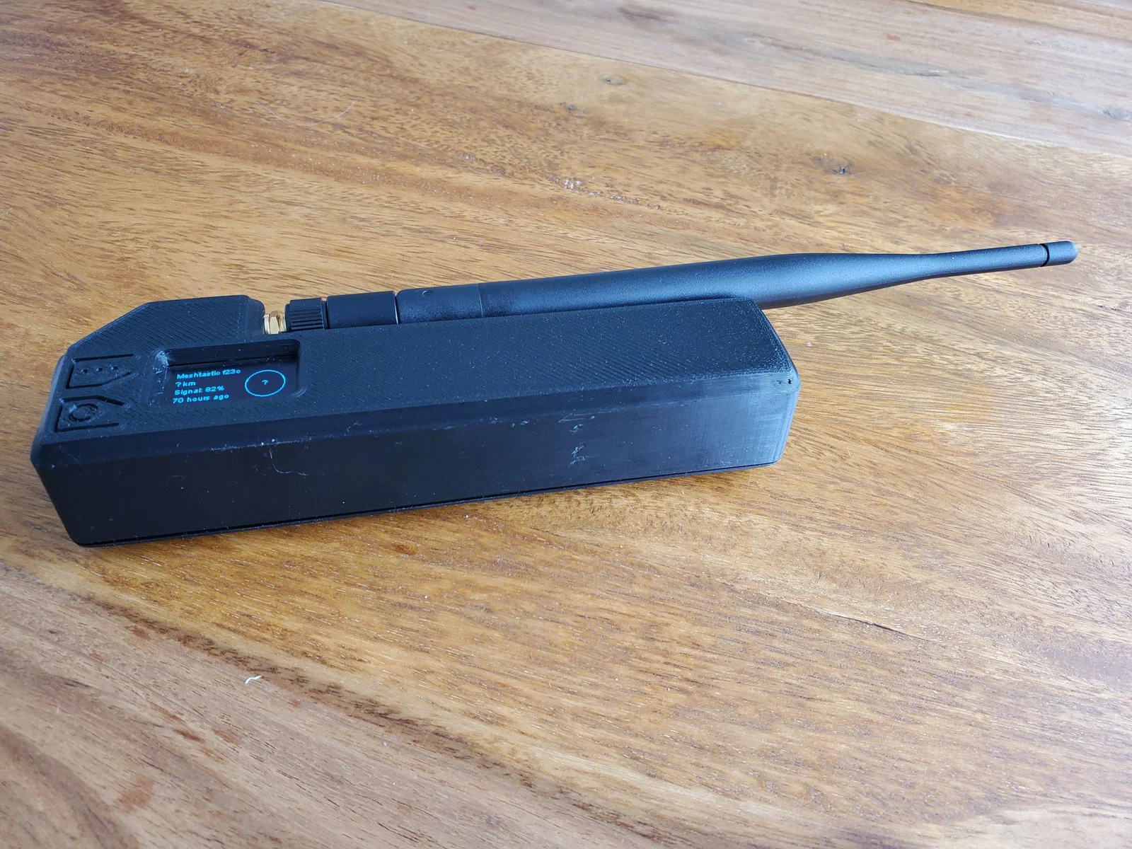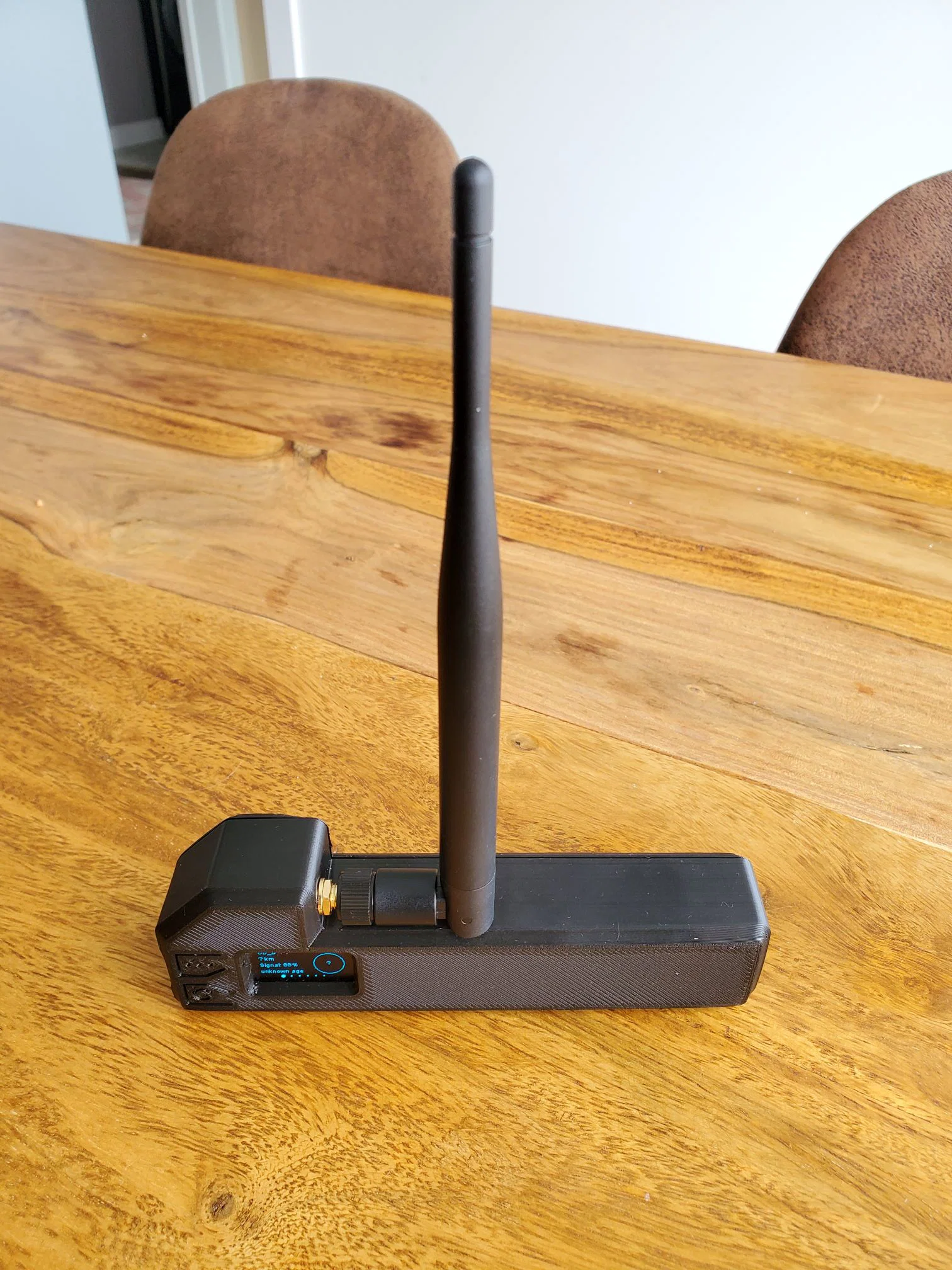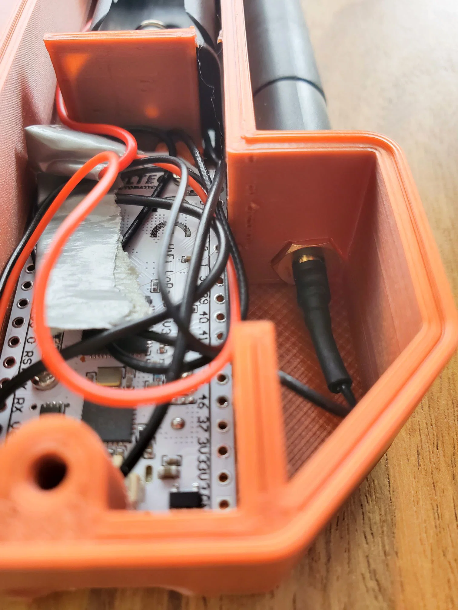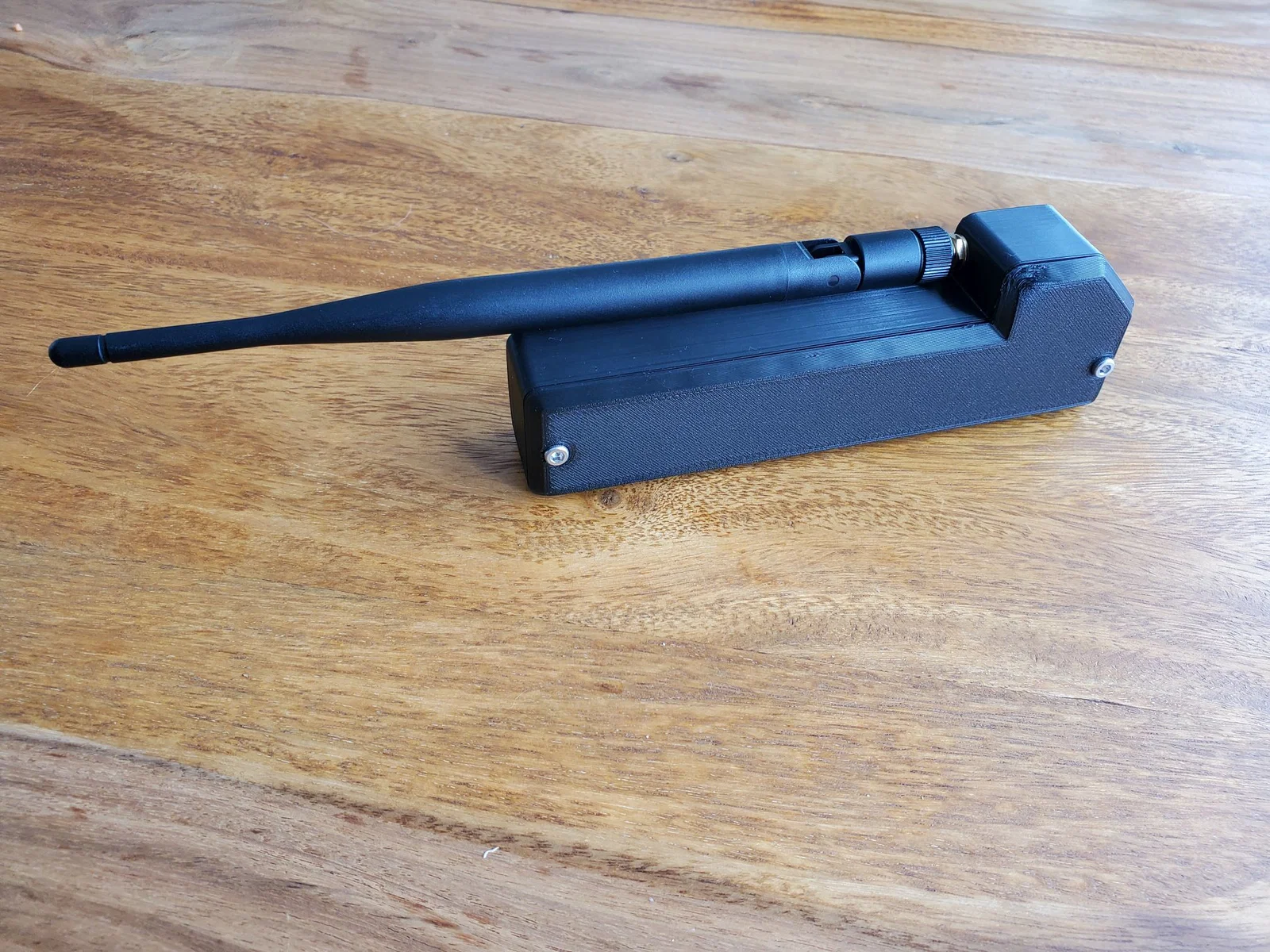 Mình muốn tìm một chiếc vỏ cho Heltec V3 sao cho vừa tiện bỏ túi mang theo, vừa để được gọn gàng trên bàn làm việc mà vẫn đảm bảo thời lượng pin tốt. Mẫu vỏ này được thiết kế theo kiểu dáng dài để đặt Heltec và pin 18650 nối tiếp nhau thay vì chồng lên nhau. Mình chọn cách thiết kế này để khi bỏ vào túi quần, túi áo hay ngăn đựng bình nước của balo đều rất thoải mái, đồng thời vẫn chừa chỗ cho ăng-ten lộ ra ngoài nếu cần. Mình có dùng một loại ăng-ten bẻ góc 90 độ để có thể đặt thiết bị nằm phẳng trên bàn hoặc bệ cửa sổ.